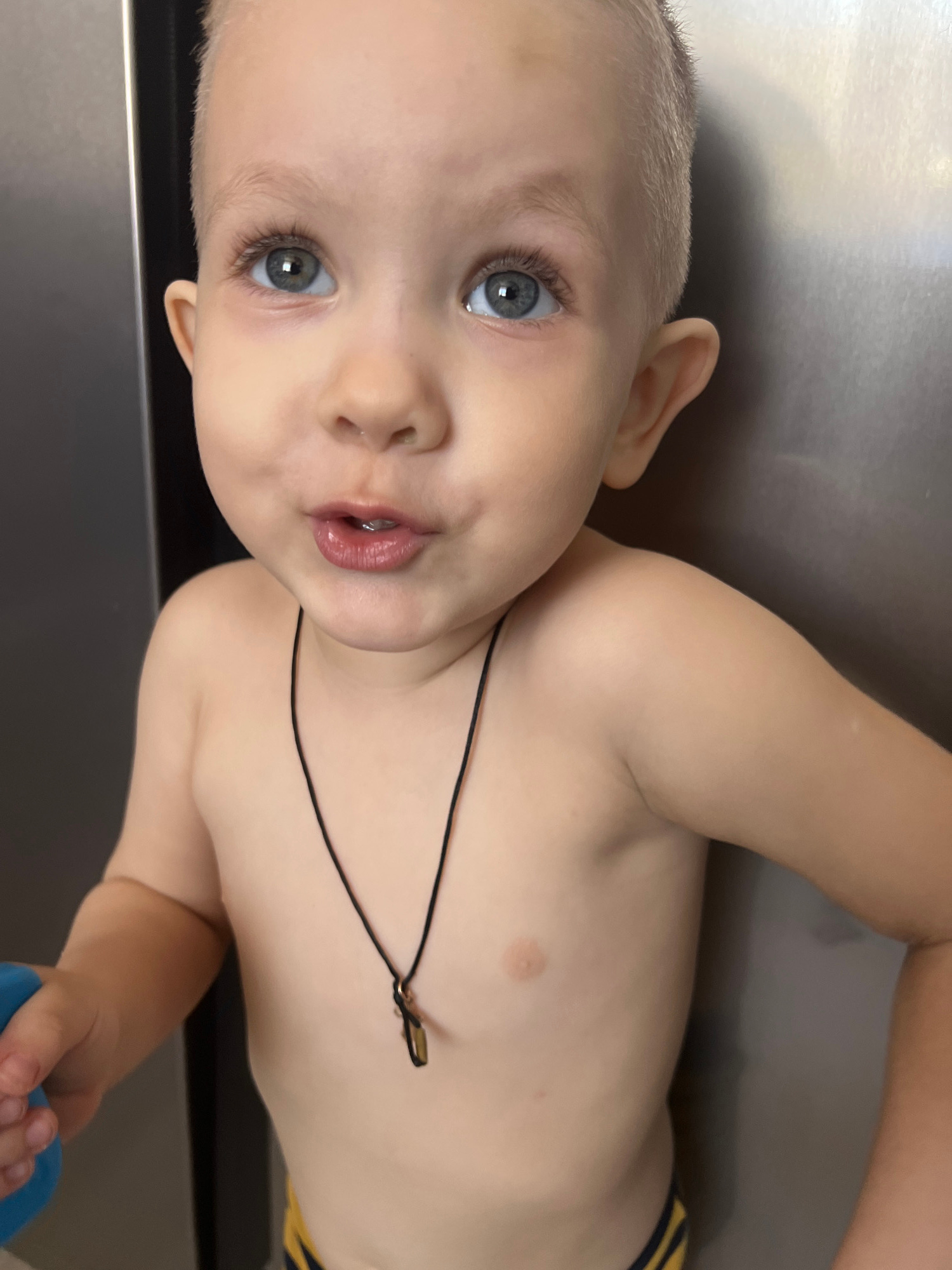A close-up, slightly rotated image shows a young child lying on a smooth, grey surface. The child has light skin, blue eyes, and short, light-colored hair. The child's torso is visible and appears bar…read more
