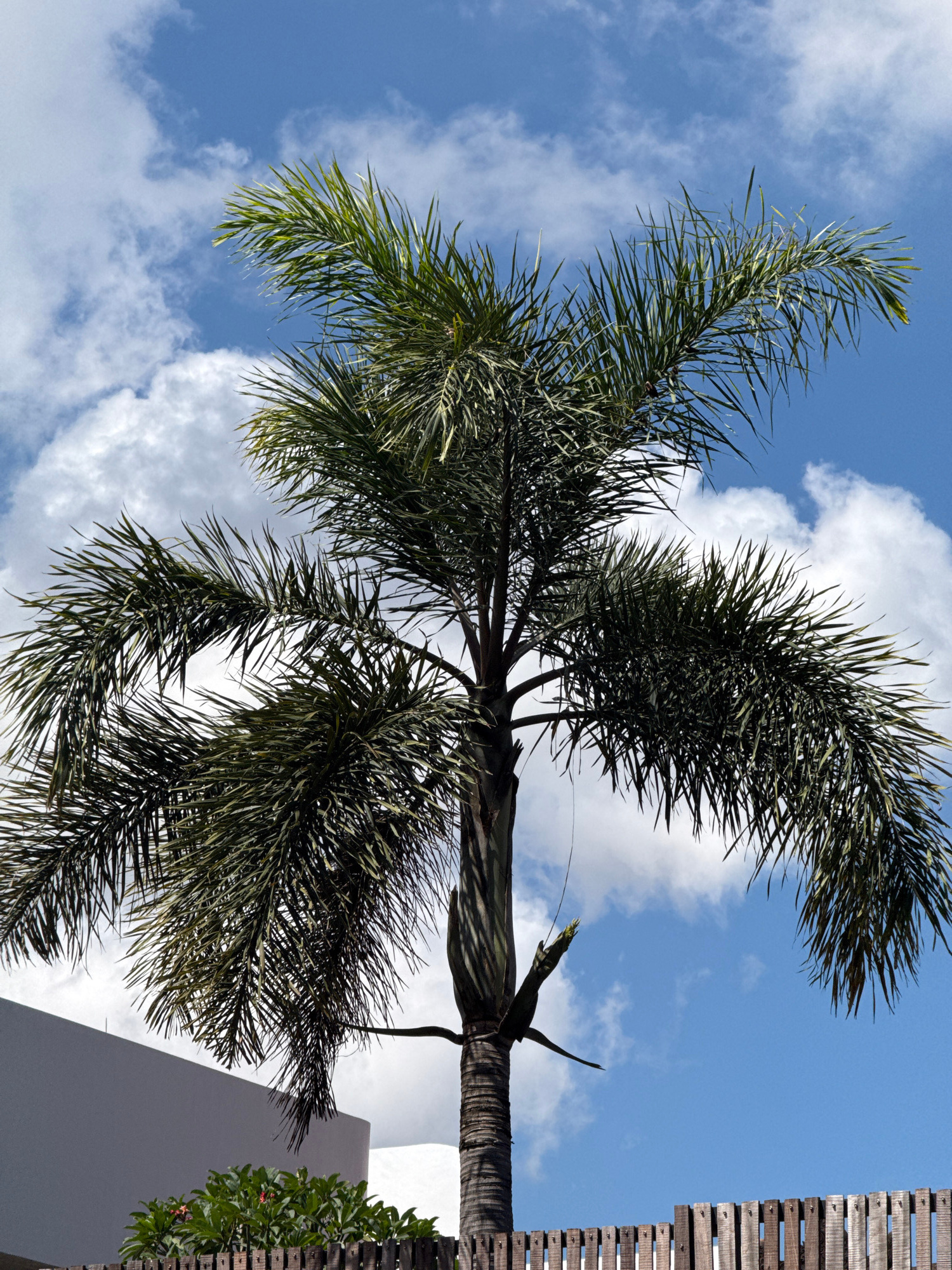 This outdoor photograph, rotated 90 degrees clockwise, captures a vibrant tropical scene under a clear blue sky dotted with fluffy white clouds. The dominant subject is a tall palm tree, likely a Foxt…read more