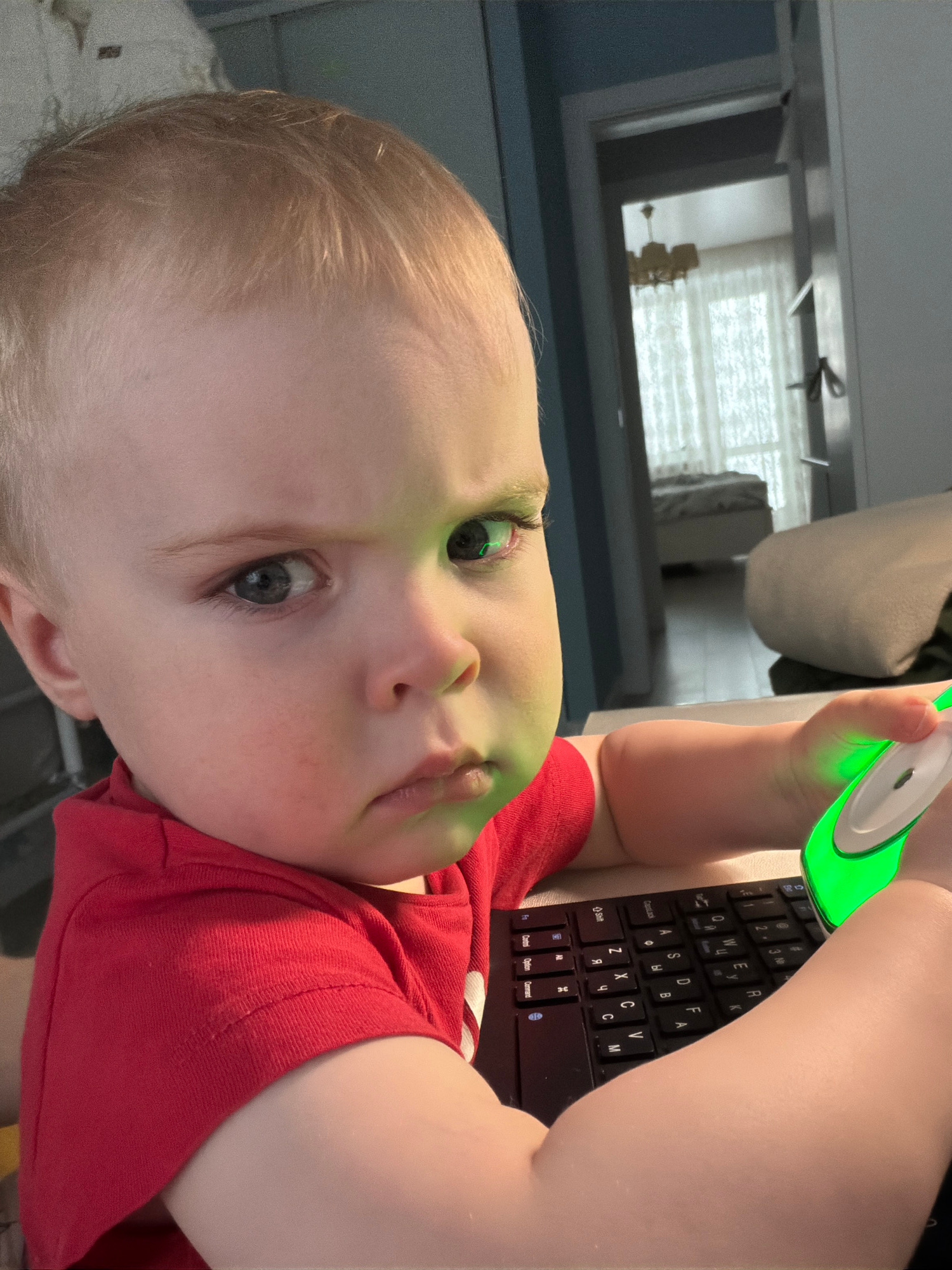 A baby lies on his back, holding a glowing green object with a white center above his face. The baby is wearing a red shirt. A black keyboard is visible near the baby's hands. The background includes…read more
