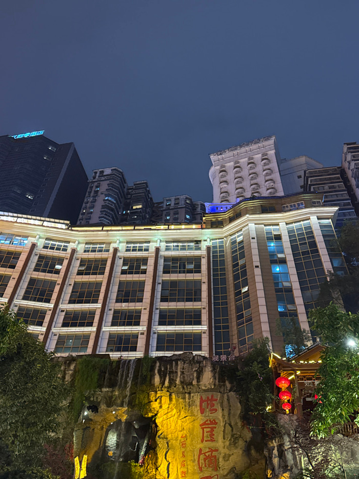 The image displays an illuminated urban architectural complex at night in Yuzhong District, Chongqing, China. The upper portion of the frame shows a dark, overcast night sky devoid of stars. In the b…read more