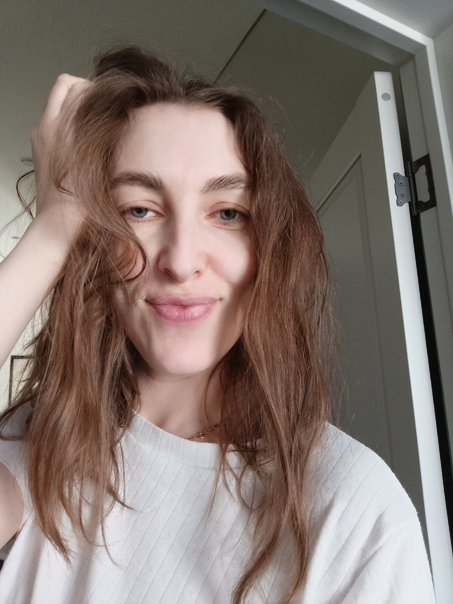 A close-up portrait shows a young woman, reportedly located in Chaikovsky, Russia, with long, wavy brown hair and blue eyes, smiling gently at the camera. Her right hand is raised, with fingers runnin…read more