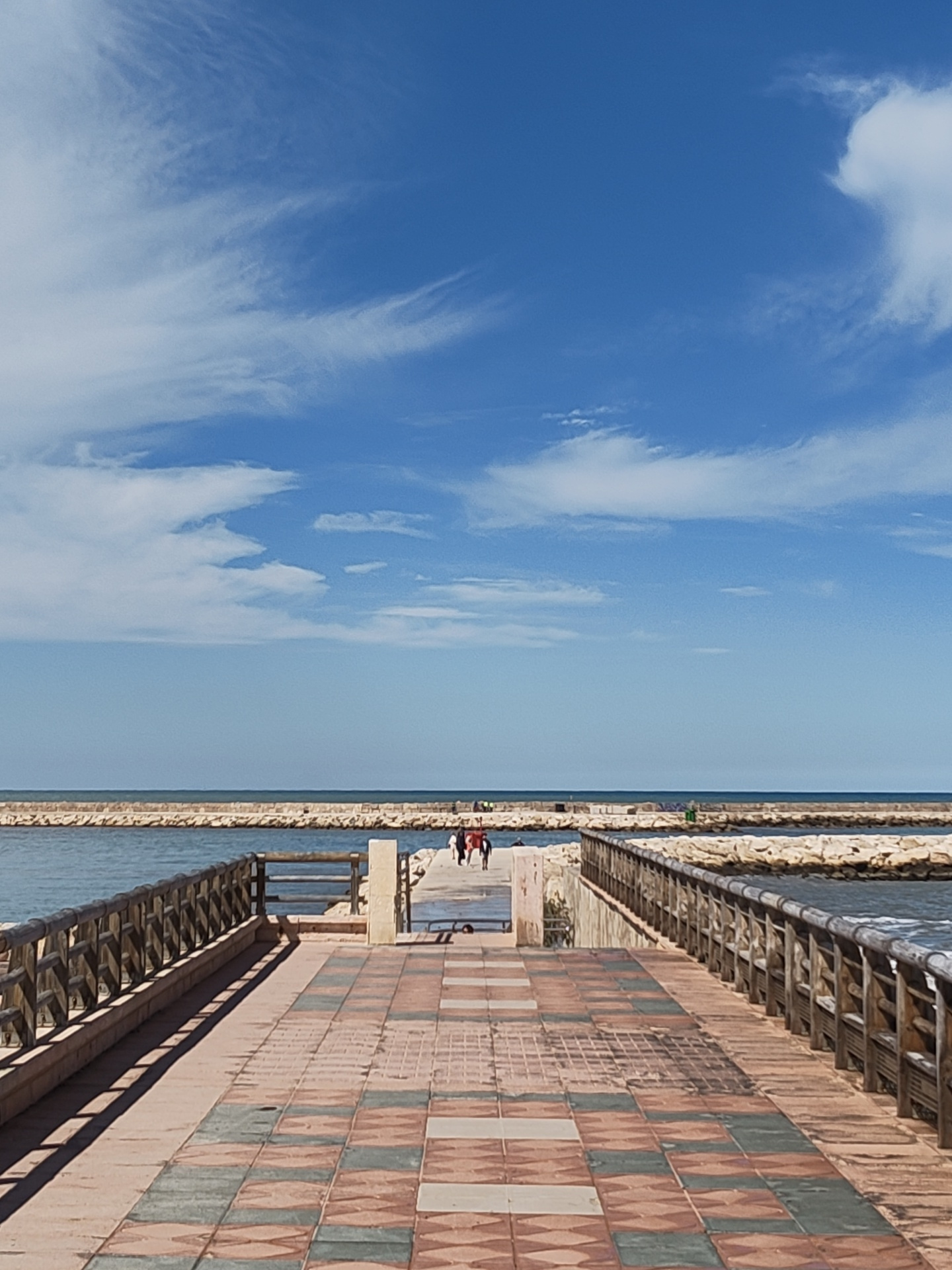 The image depicts a pier leading out into the sea in Dénia, Spain. The pier is constructed of reddish-brown and gray tiled flooring with wooden railings on either side. The sea is calm with a series o…read more