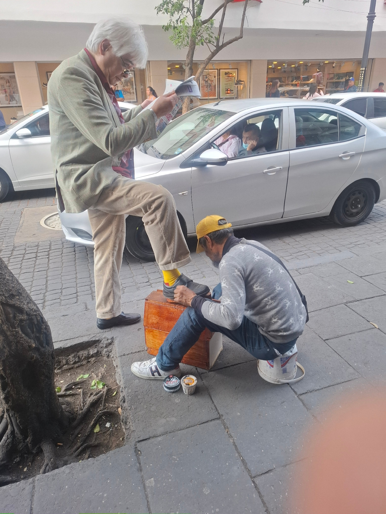The image captures a street scene in Mexico City, Mexico. An older man, dressed in a blazer and corduroy pants, sits with one leg propped on a car tire, reading a newspaper. A younger man in jeans, a…read more