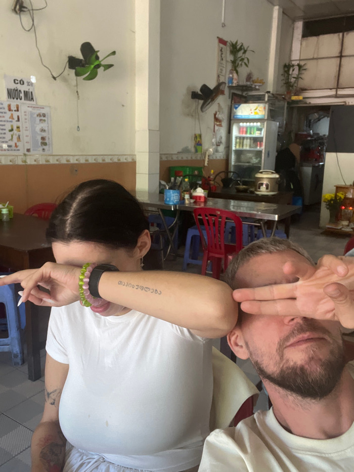 A man and woman are posing indoors, rotated sideways. The man, with a beard, holds two fingers up near his eye. The woman, with dark hair, has writing tattooed on her arm. They are in what appears to…read more