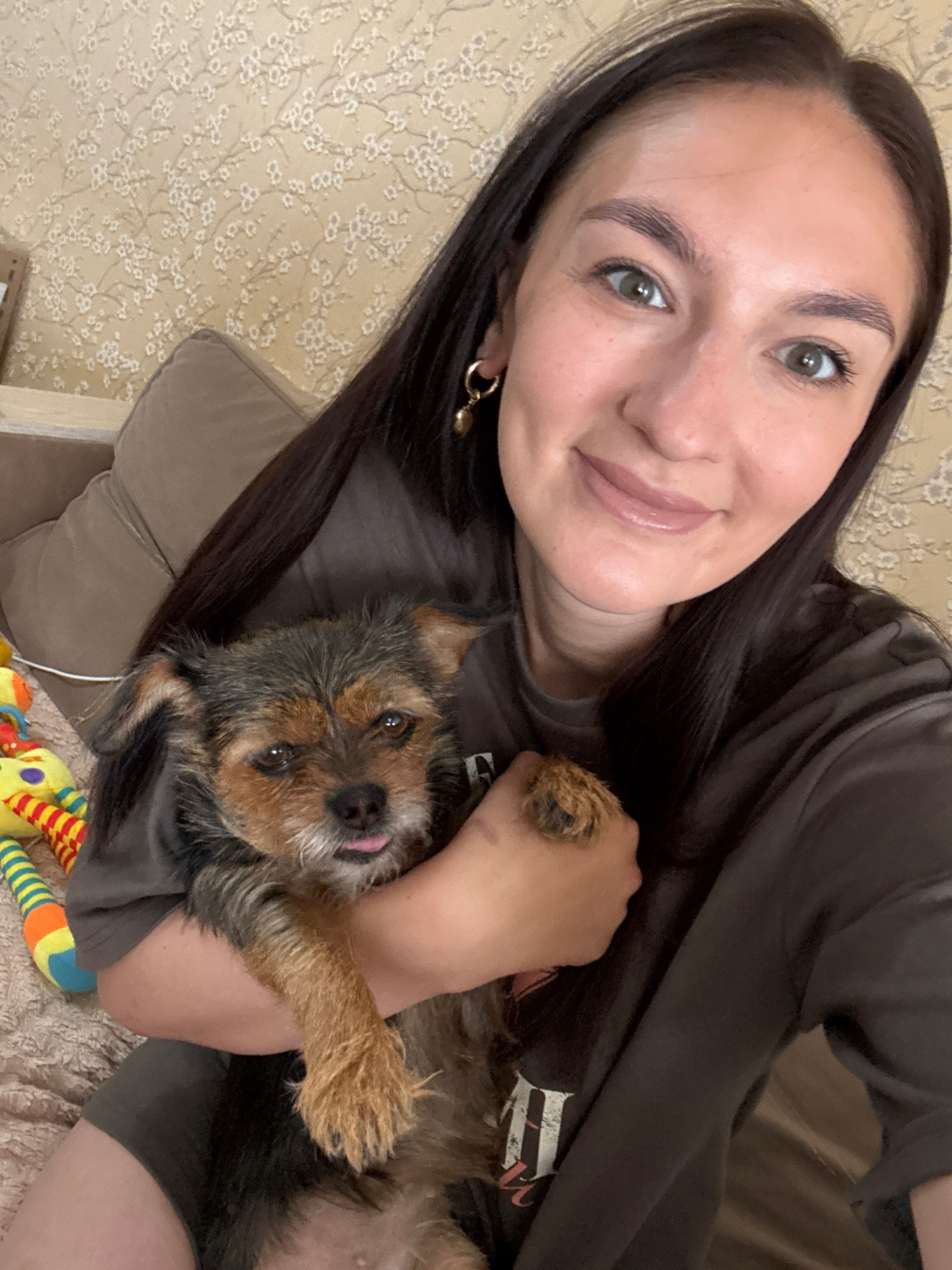 A medium shot captures a woman and a dog, likely indoors. The woman has dark hair, light skin, and wears a dark t-shirt. She holds a small, brown and black terrier-type dog in her arms. The dog's tong…read more