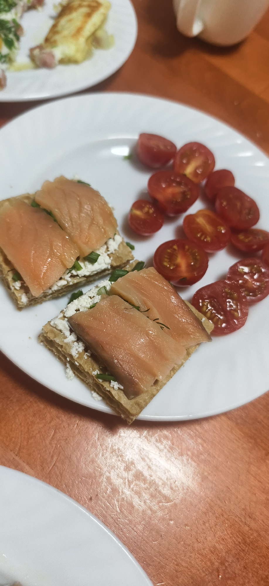 A close-up shot depicts a white plate on a wooden surface. The plate contains a meal of two crackers topped with what appears to be cream cheese or a similar spread and slices of smoked salmon. Green…read more