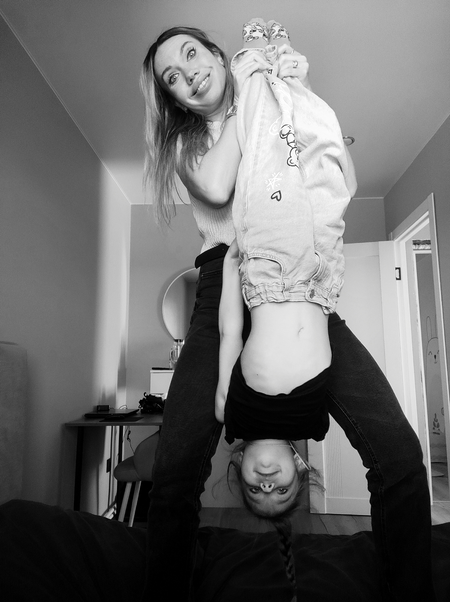 A black and white, low-angle shot depicts a woman holding a child upside down in what appears to be an indoor setting. The woman is smiling and looking towards the camera while holding the child by th…read more