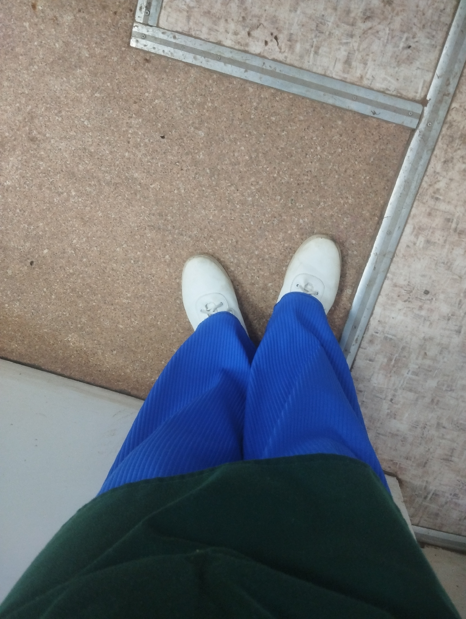 A first-person perspective image shows a person standing on a brown, mottled floor with a metal-edged threshold in what appears to be an indoor space. The person is wearing white tennis shoes and blue…read more