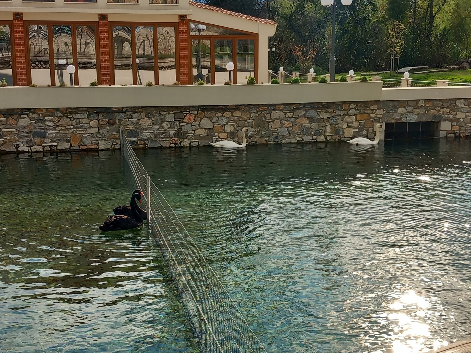 The image captures a serene scene in the Agia Varvara Park in Drama, Greece. The focal point is a body of water with two black swans swimming near a metal fence in the foreground, and two white swans…read more