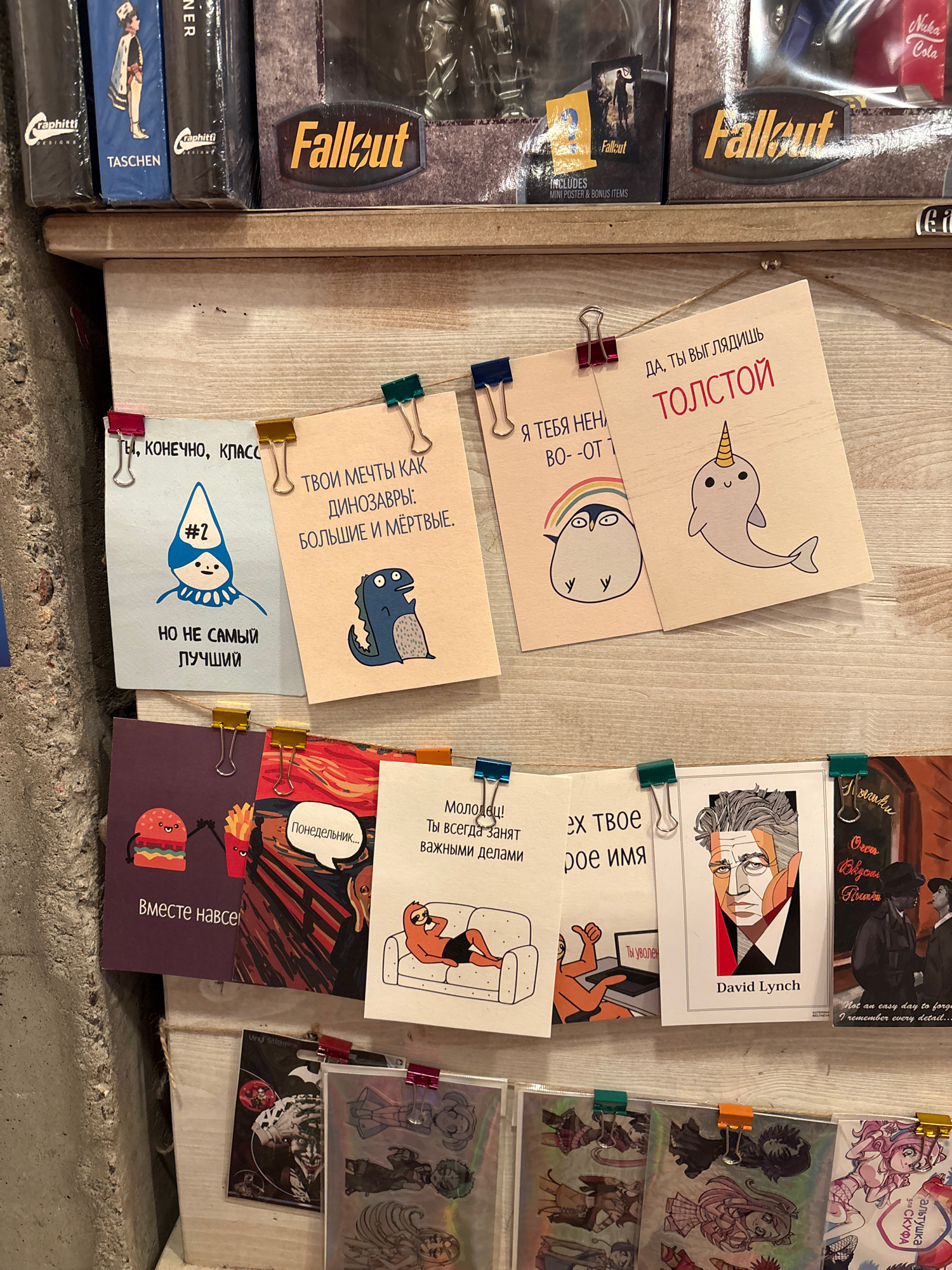 This image depicts a shelf in a store, possibly located in Saint Petersburg, Russia, based on the presence of Russian text. On the left are stacked items, including copies of "Fallout," art books fro…read more