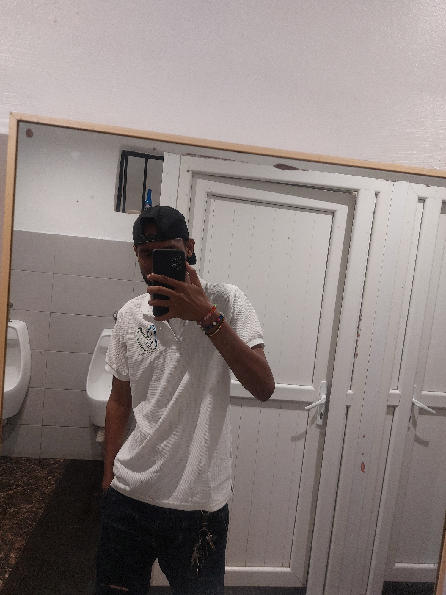 A man is taking a selfie in a mirror in what appears to be a public restroom. The man is wearing a white collared shirt, dark pants, and a black baseball cap. He is holding a black smartphone in front…read more