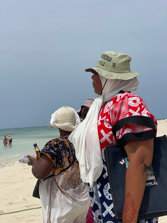 The image depicts a beach scene in Zanzibar, Tanzania, under an overcast sky. Three women stand on a light-colored sandy beach, observing the turquoise sea. In the foreground, a woman with dark skin…read more
