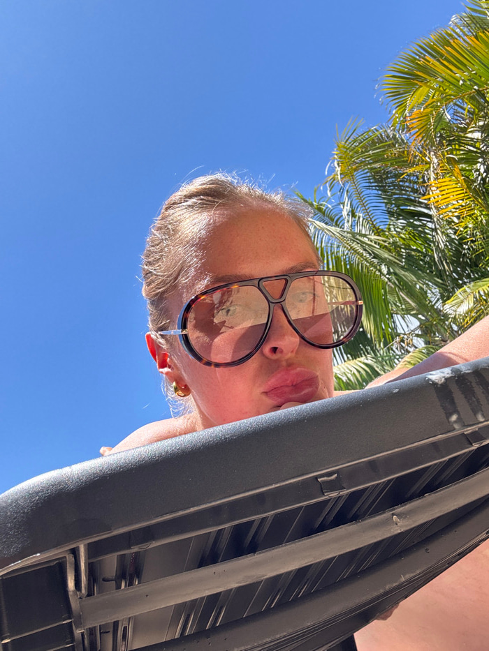 A low-angle shot focuses on a person wearing oversized sunglasses, positioned against a bright blue sky and lush palm trees. The perspective is unusual, emphasizing the person's face and the sky above…read more