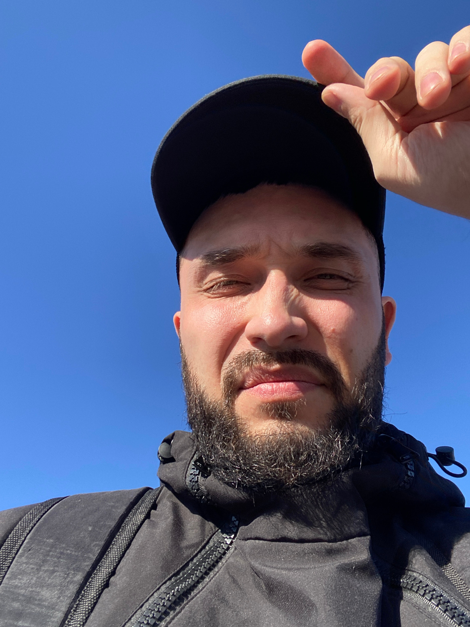This media file captures a close-up, slightly upward-facing portrait of a man against a clear blue sky. The man has a dark beard and is wearing a dark baseball cap and a dark jacket with visible zippe…read more