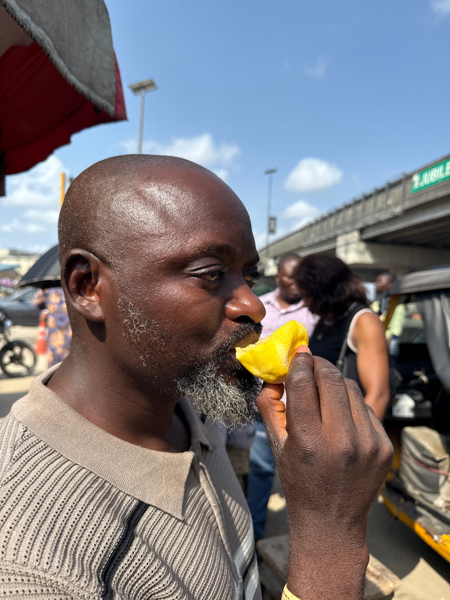 A close-up shows a man with dark skin, a shaved head, and a salt-and-pepper beard. He is holding a piece of yellow fruit, possibly a lemon, in his right hand and bringing it to his mouth. He is wearin…read more