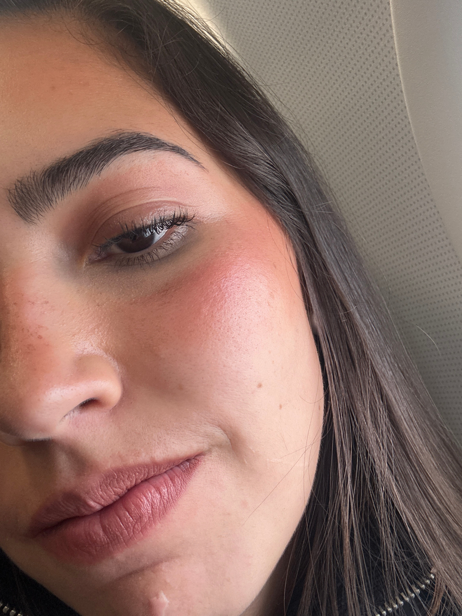 The image is a close-up, angled shot of a woman's face. She has brown hair, fair skin with freckles, and is wearing makeup, including blush, eyebrow filler, and lipstick. Her eye is open and focused.…read more