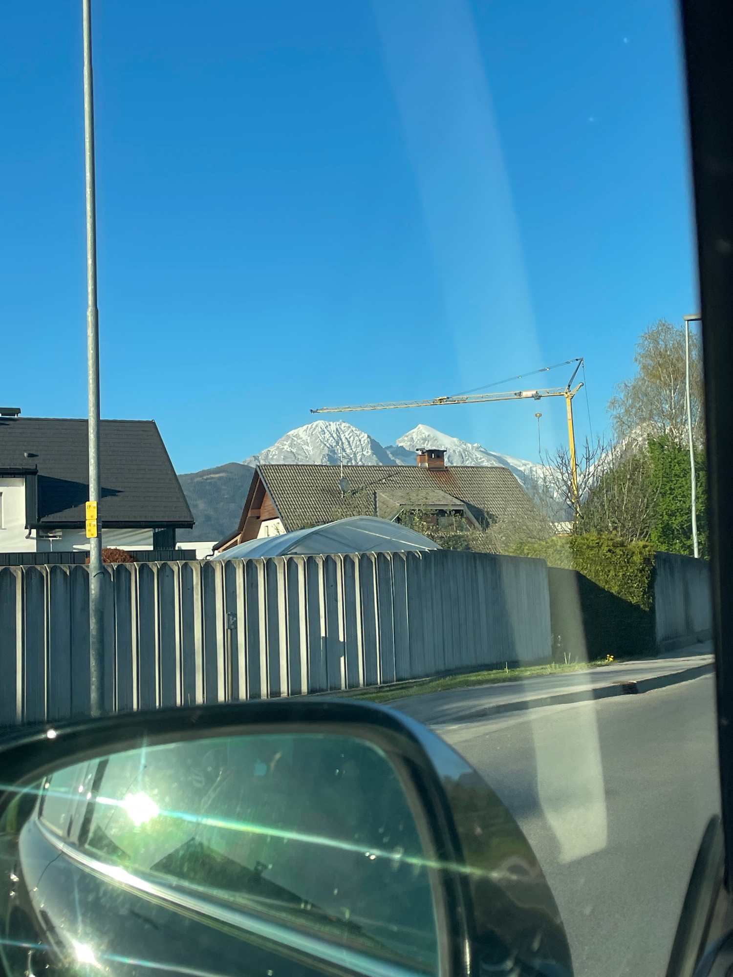 The image shows a view from inside a car. In the background, there are snow-covered mountains and a blue sky. A yellow crane is visible near a building with a chimney. In the foreground, there's a gliβ¦read more