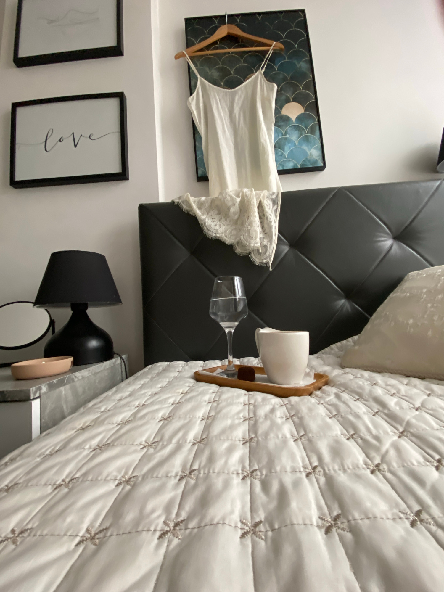 A photograph taken indoors shows a bedroom. There is a bed with a gray leather headboard. The bedspread is white with a pattern of embroidered crosses. There is a white pillow on the bed. A small wood…read more