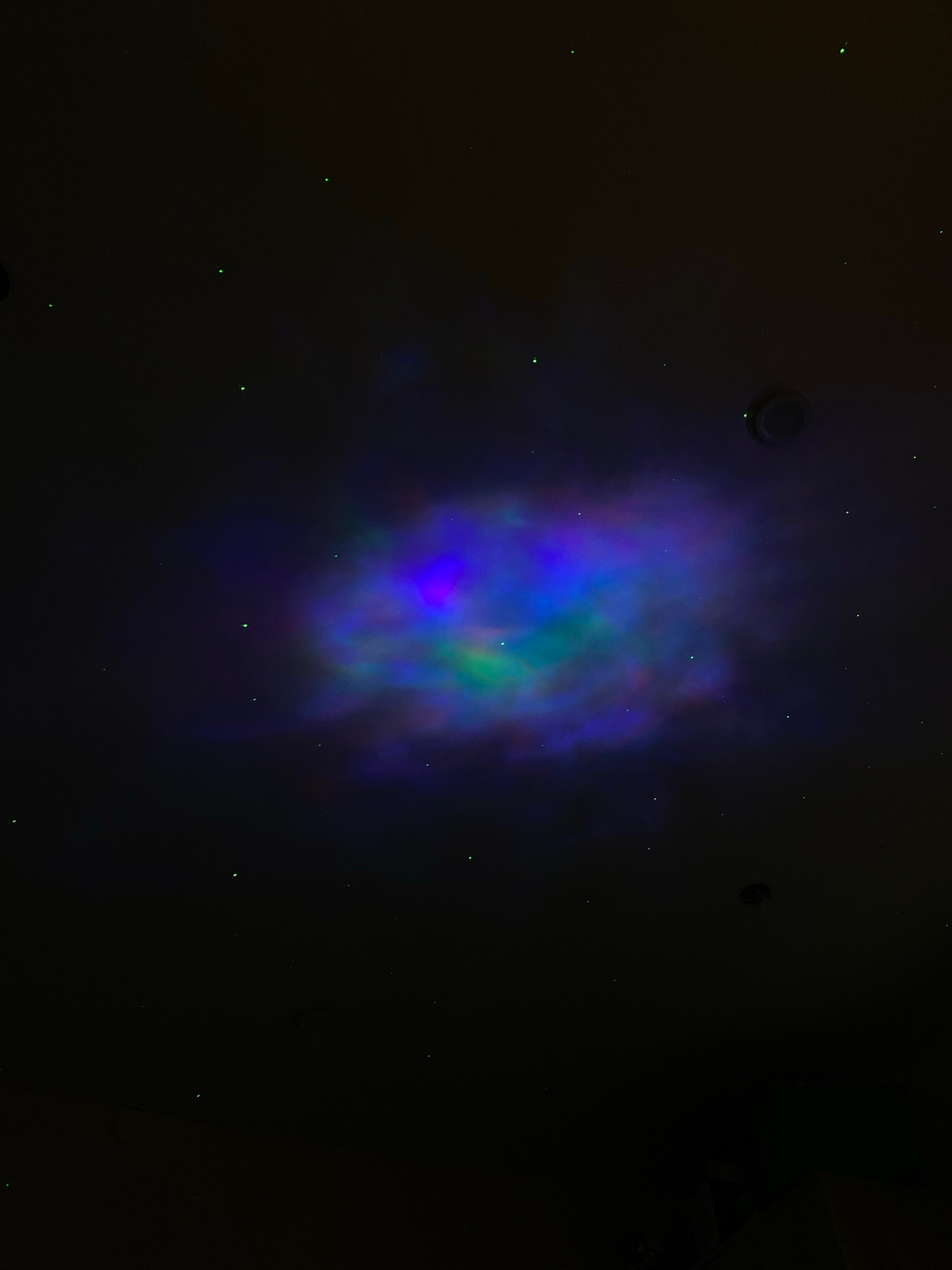 The image shows a dark, likely indoor, space with a nebula-like projection of blue, green, and purple light in the center. There are also small green dot-like lights scattered across the ceiling. A ci…read more