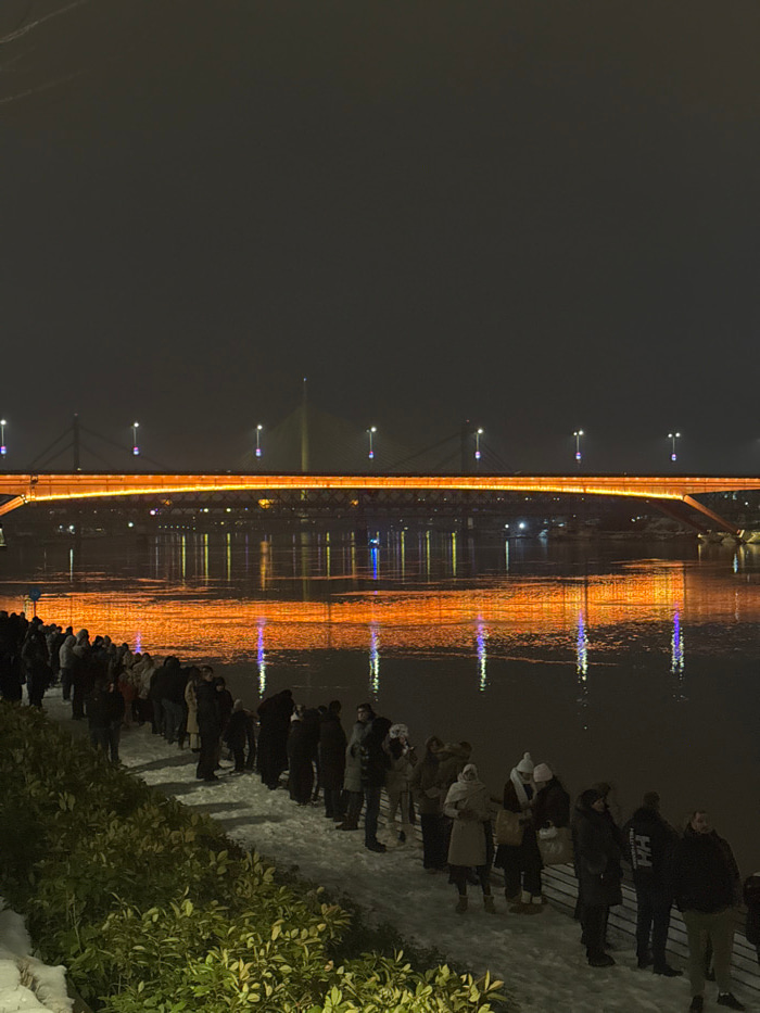 Night scene showing a lit bridge reflected in water. A line of people stands along the edge of the water near some bushes and snow. The lights of the bridge create a vertical strip of orange reflectio…read more