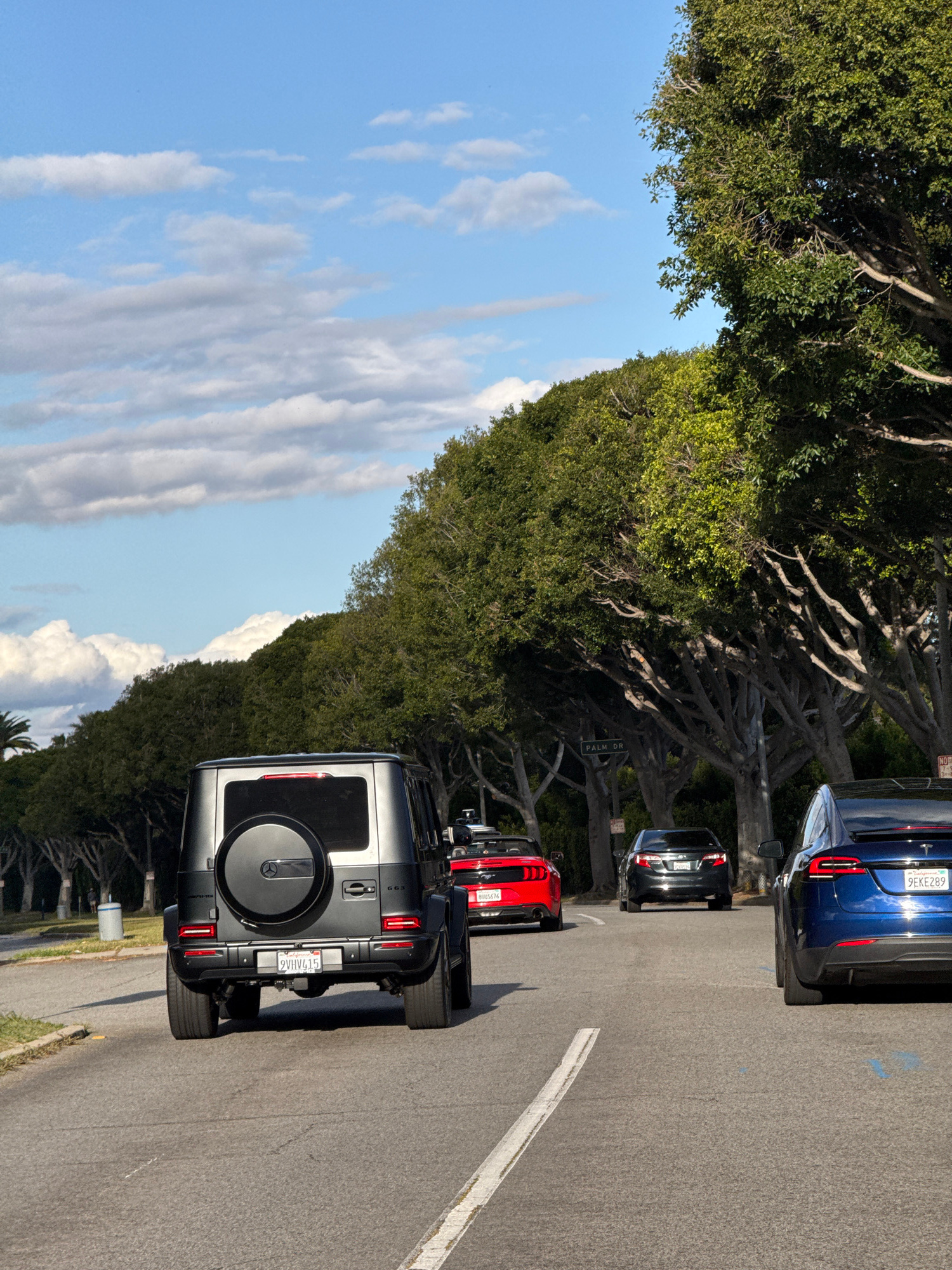 The photograph depicts a street scene in Beverly Hills, California. The image is dominated by a row of parked cars along the right side of the frame. The cars are oriented towards the top of the image…read more