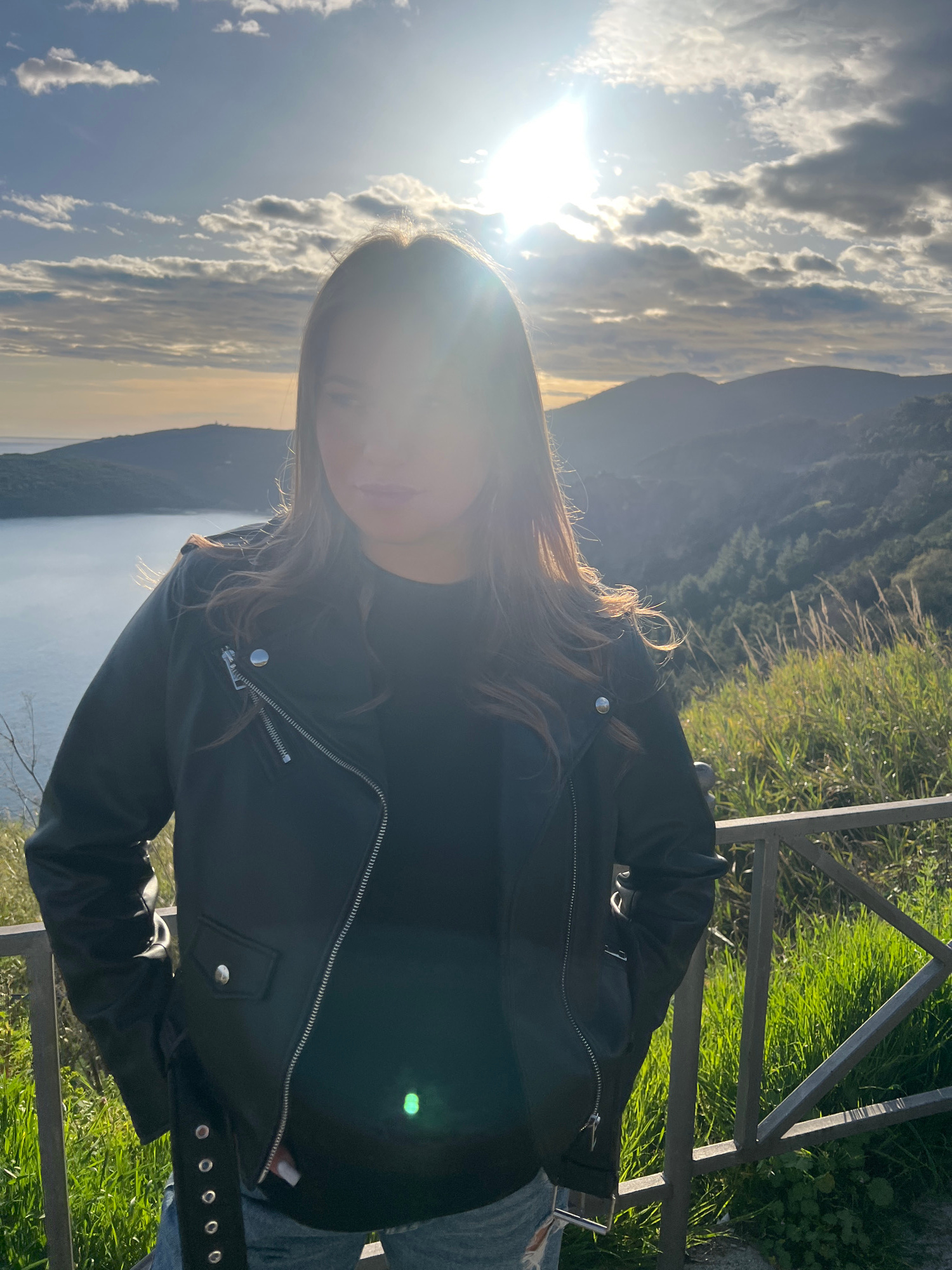 The image shows a person wearing a black leather jacket standing outside. The background features mountains, clouds, and what appears to be a body of water. There's also a railing and green grass pres…read more