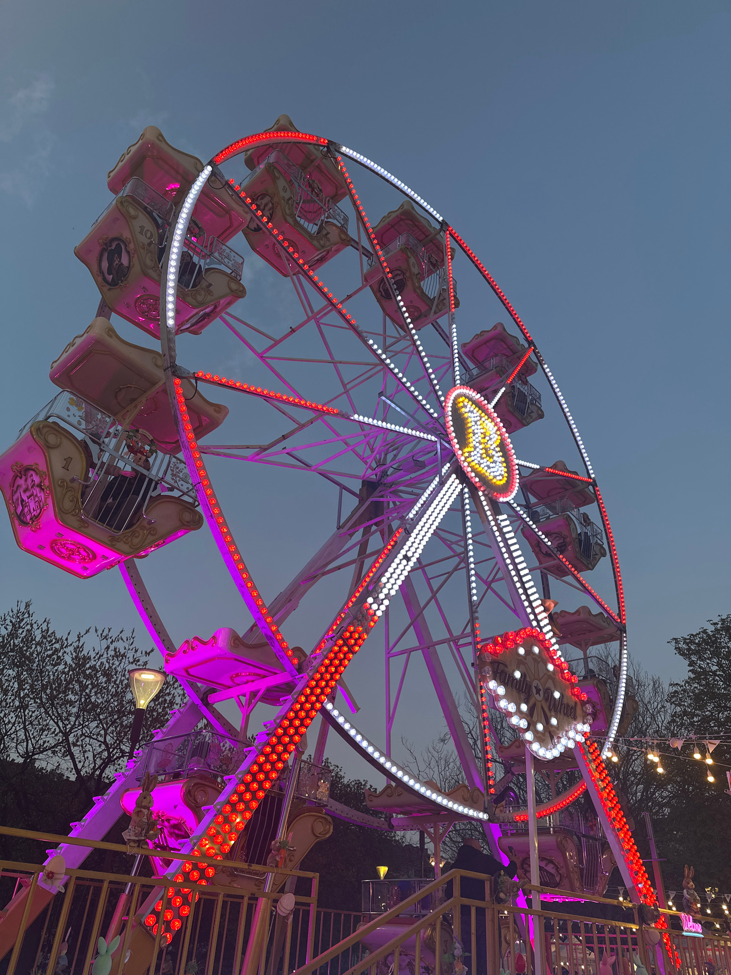 The image depicts a brightly lit Ferris wheel against a dusk sky. The wheel has pink and beige gondolas decorated with ornate designs. Red and white lights outline the wheel's structure and illuminate…read more