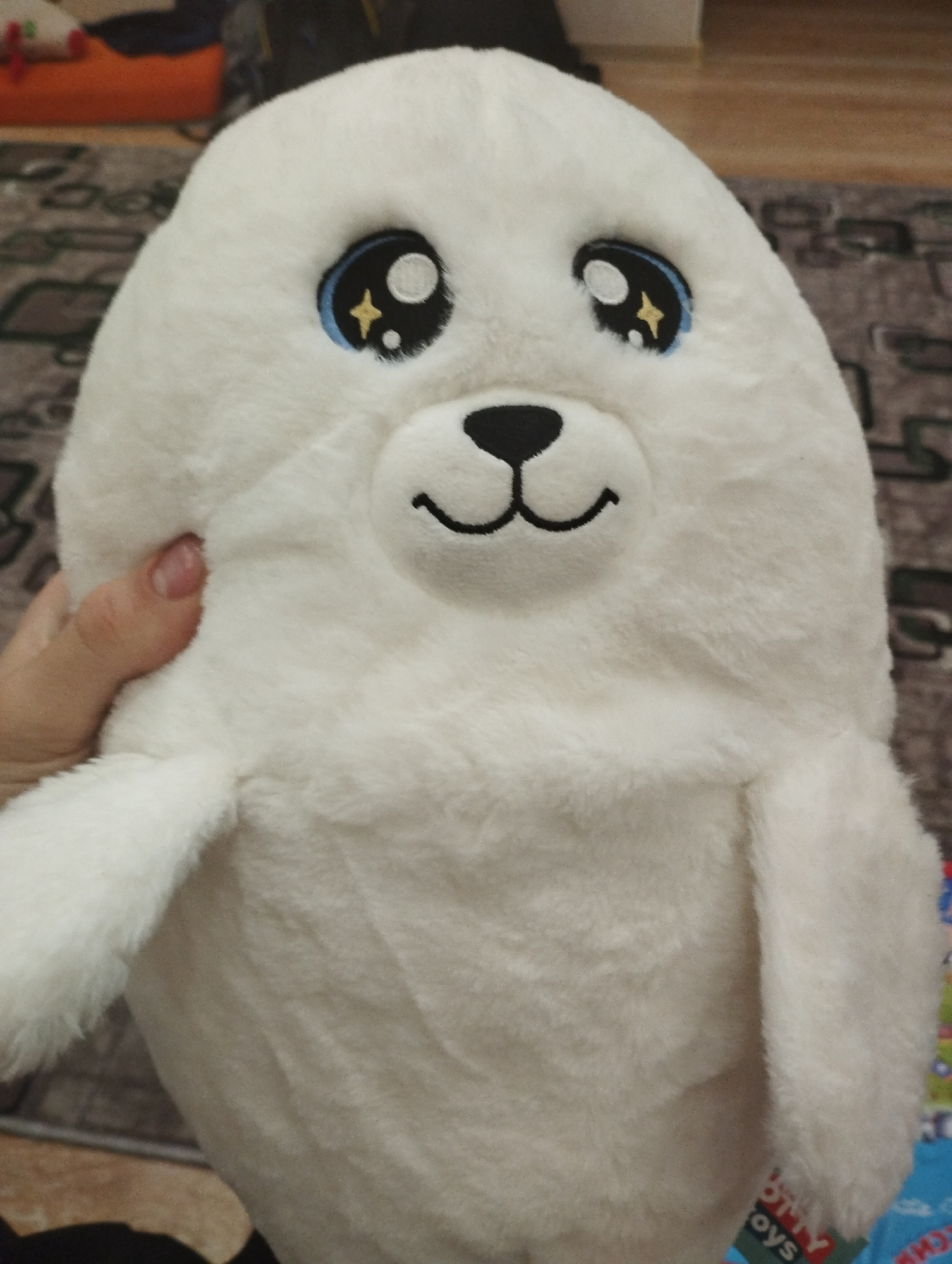 The image shows a fluffy, white seal plush toy with large, cartoonish eyes featuring black pupils, white highlights, and blue edges. The seal has a black nose and a small, curved black mouth giving it…read more