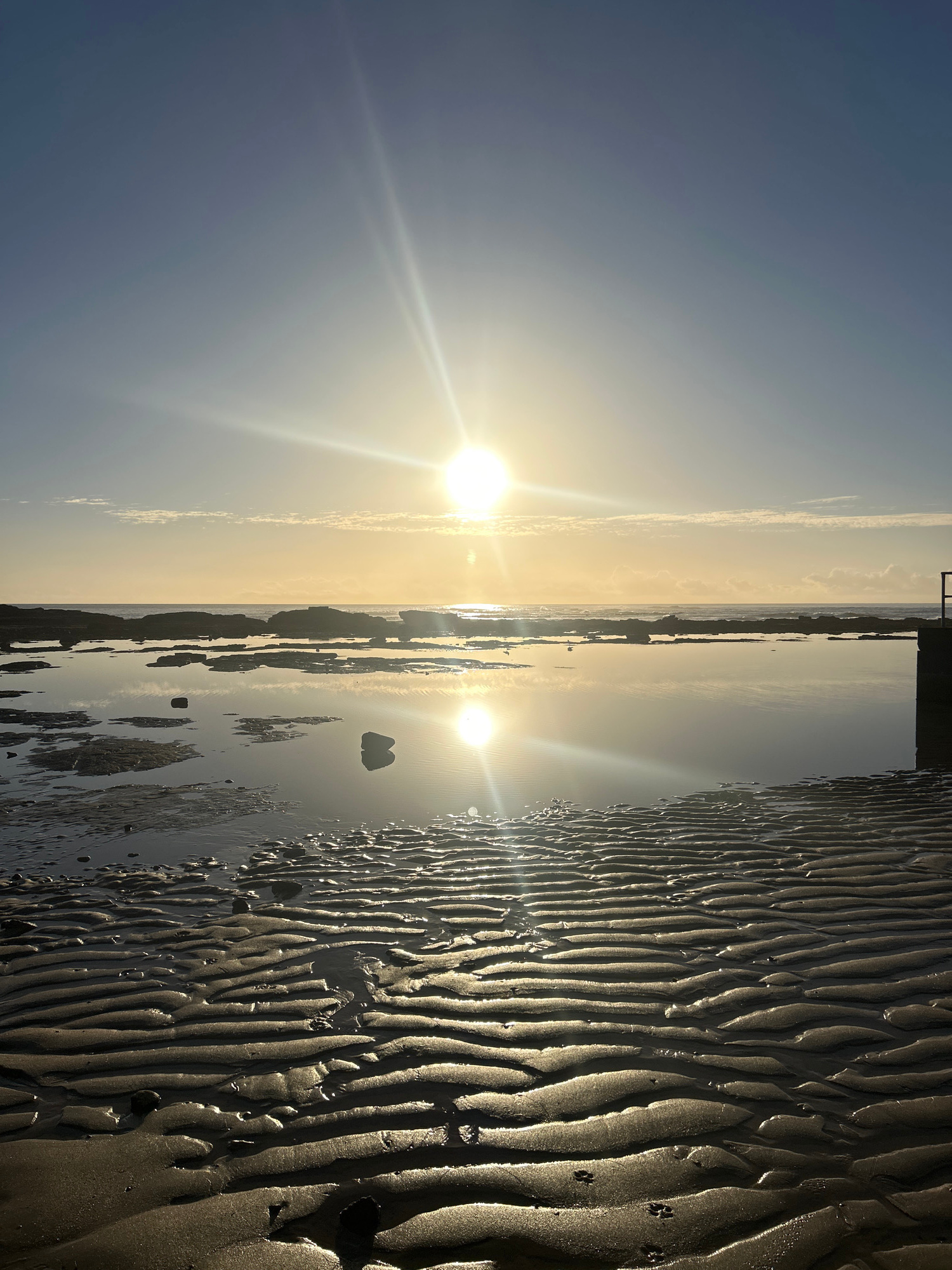 This image depicts a coastal scene at Bulli, Australia, observed during either sunrise or sunset. The sun is positioned low in the sky, slightly to the right of the vertical center, emitting strong le…read more