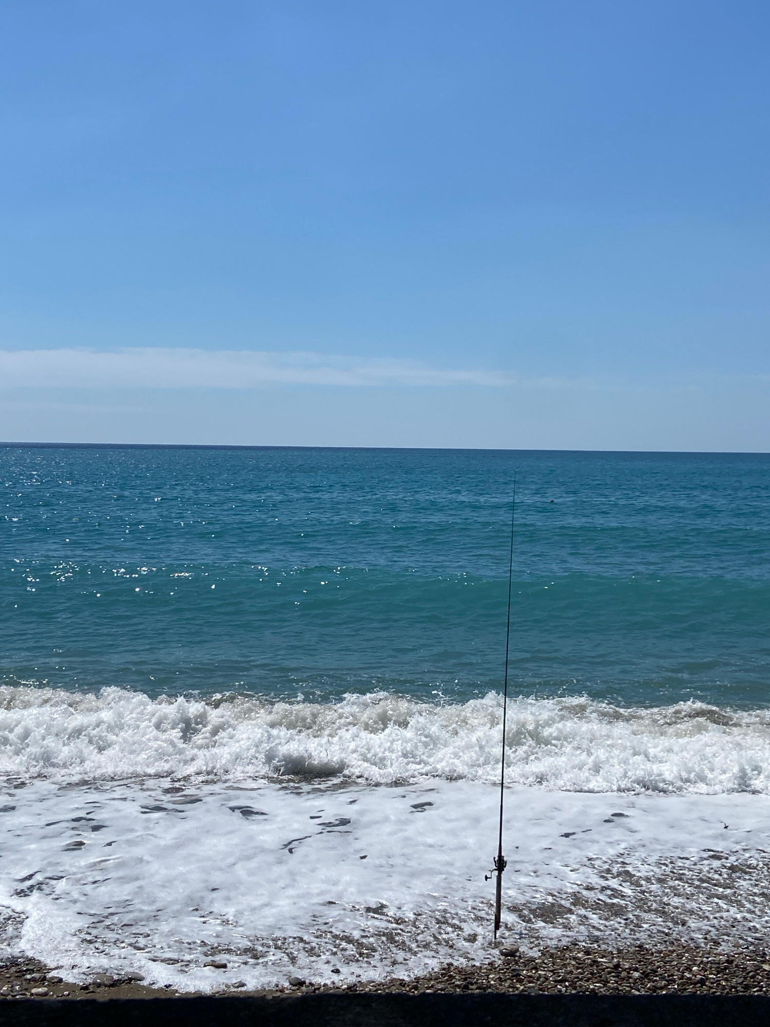 A fishing rod is stuck in the gravel of a coastal beach in Bar, Montenegro. The rod extends over waves approaching the coast and into the sea under a clear, blue sky.