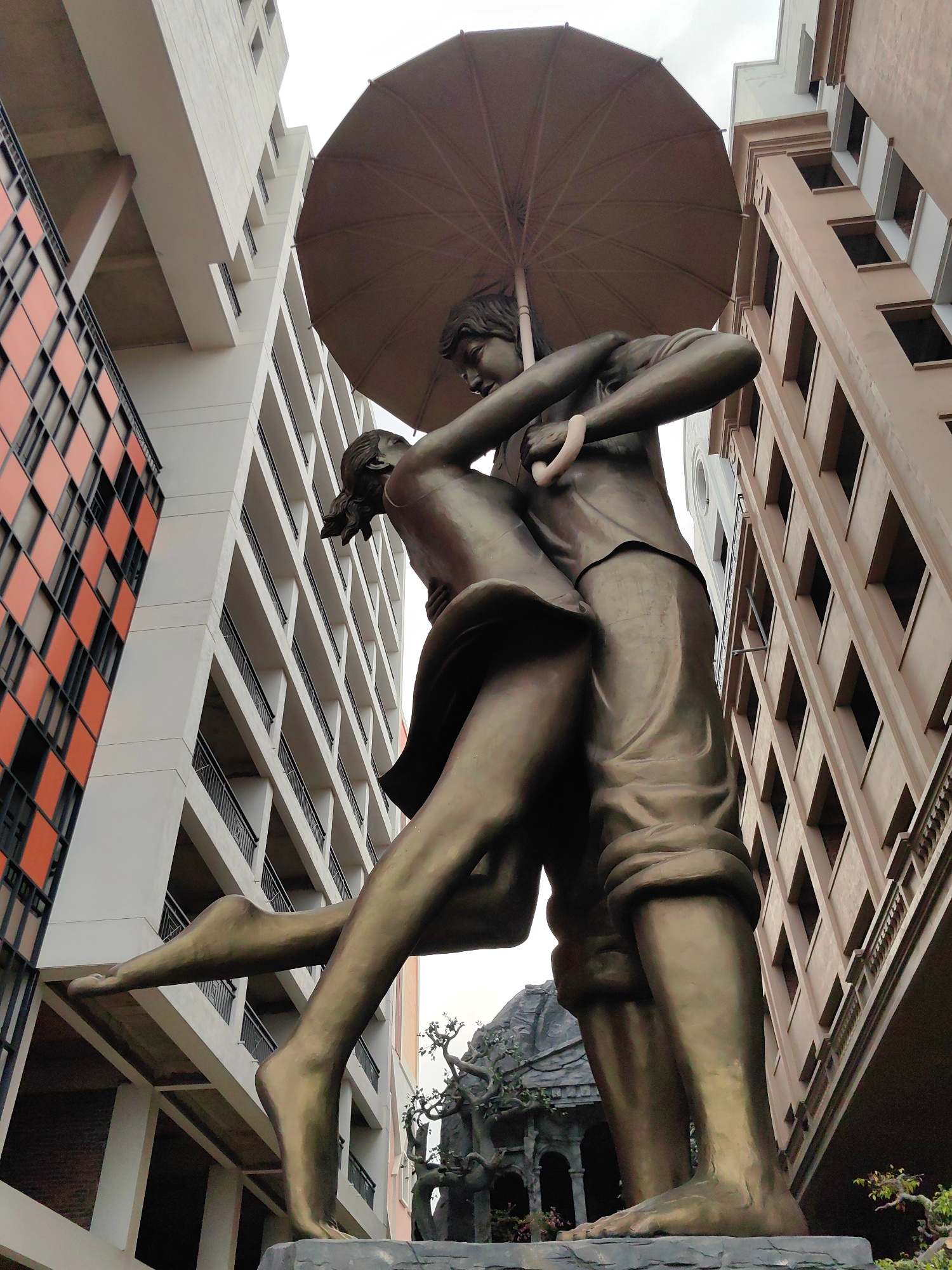 A low-angle shot depicts a bronze statue of a couple embracing under an umbrella, set against a backdrop of modern buildings in Tuan Chau Ward, Vietnam. The statue features a man holding an umbrella o…read more
