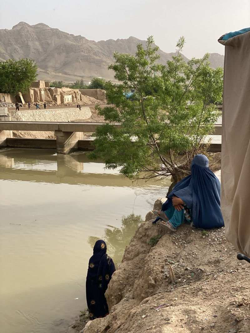Two women stand near a river in Khana Gerdab, Afghanistan, on a bright day. The woman in the foreground is positioned closer to the riverbank and wears a dark blue garment patterned with gold sunflowe…read more