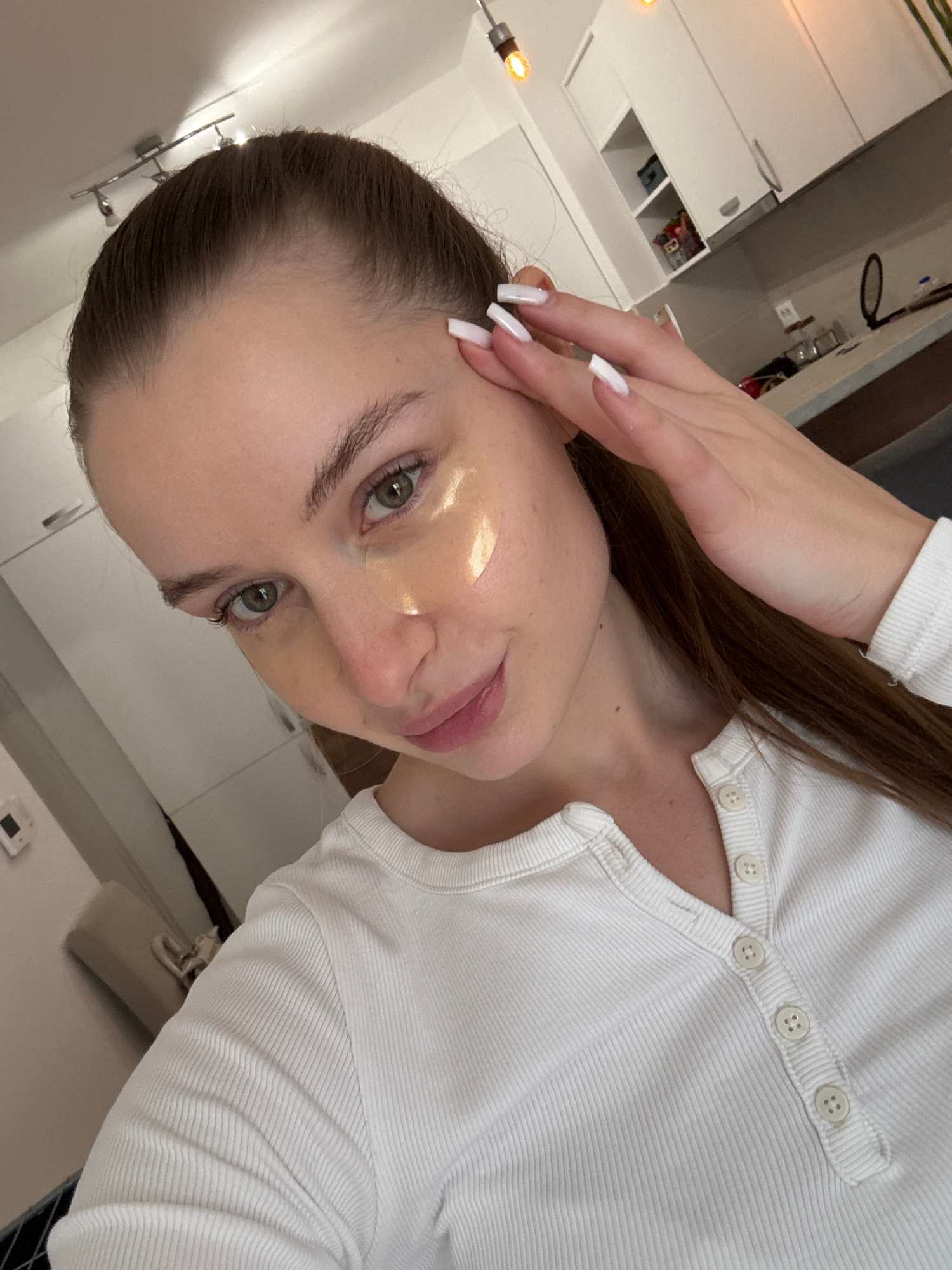 A woman with brown hair, green eyes, and a golden patch under her left eye is posing for a photo. Her left hand with white nails is positioned near her forehead. She is wearing a white, long-sleeved,…read more