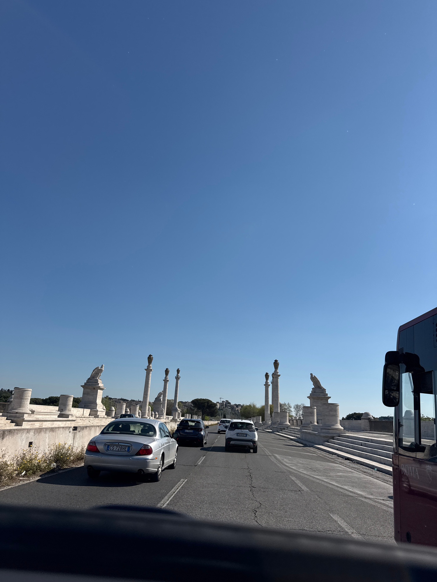 The image, taken from a moving vehicle, depicts a view of the Ponte Vittorio Emanuele II in Rome, Italy. A line of cars is traveling along the bridge, with the statues and architectural details lining…read more