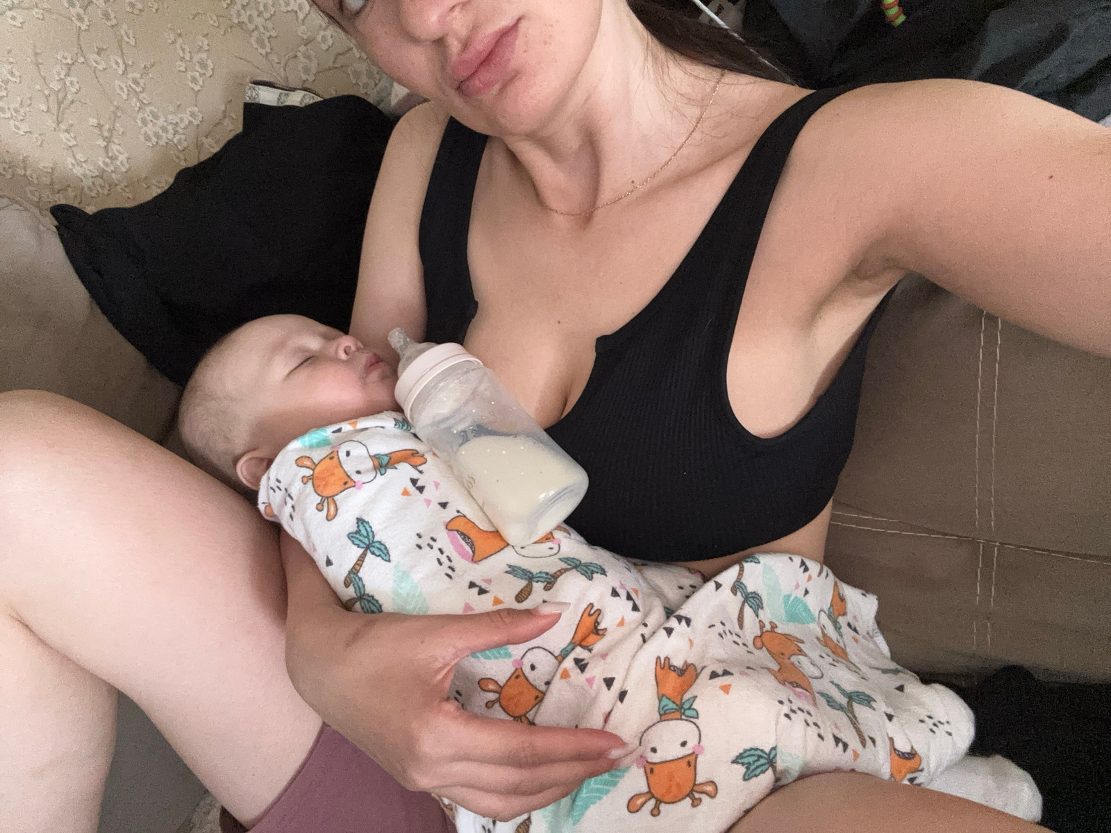 A woman wearing a black tank top is holding a baby who is wrapped in a blanket with a cartoon giraffe and palm tree pattern. The baby is lying down with a bottle in their mouth. The woman is sitting o…read more