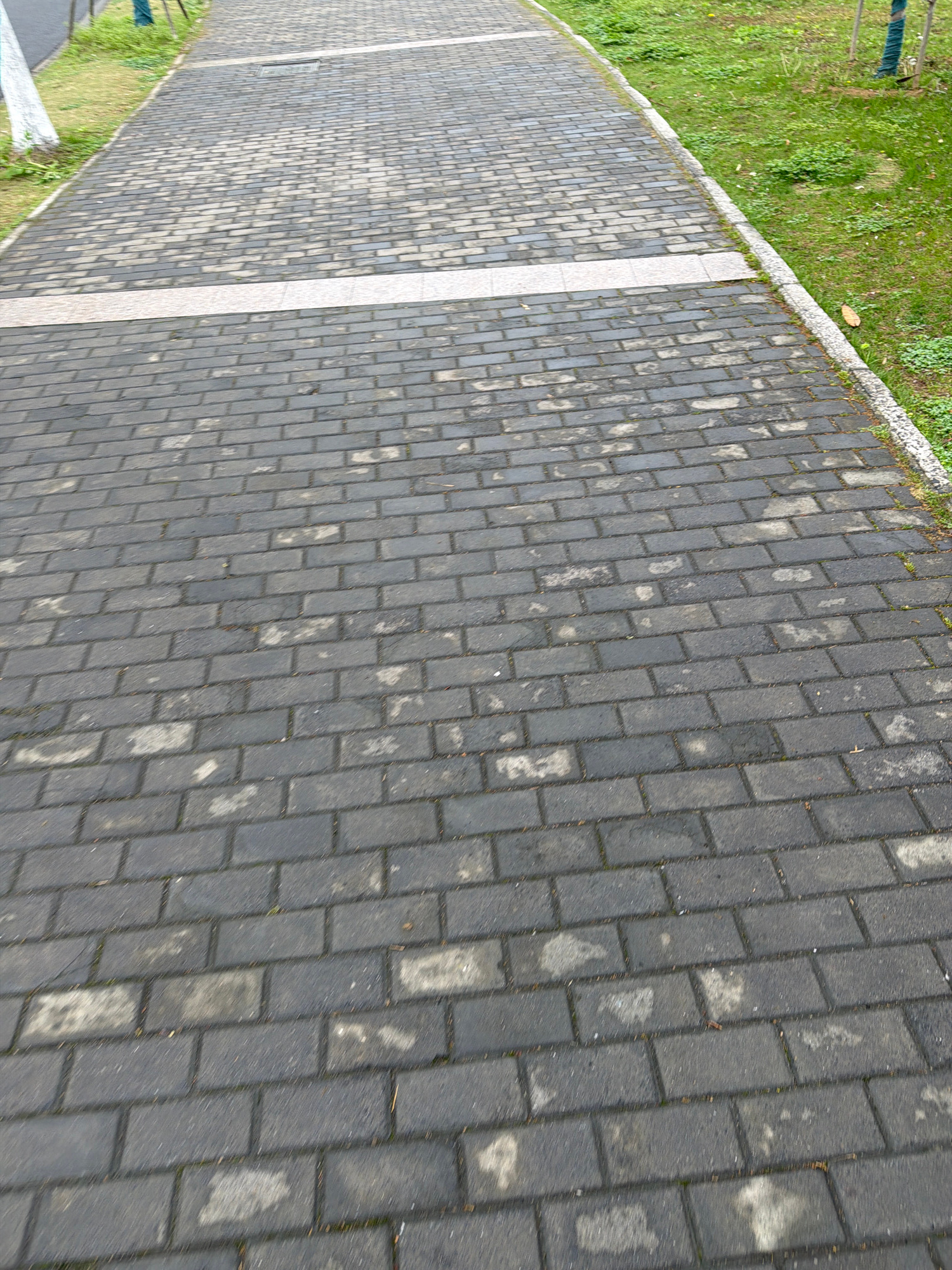 The image shows a paved walkway in Jiangning District, China. The walkway is constructed of rectangular gray pavers, with a light gray border running along one side. Adjacent to the border is a strip…read more