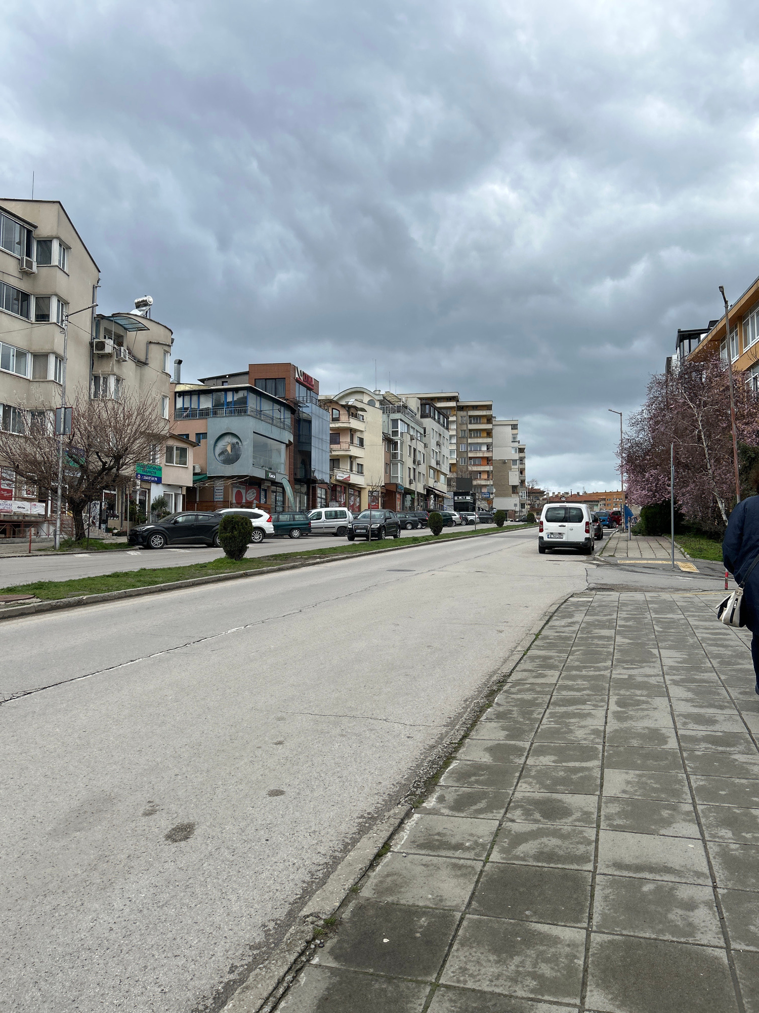 The image depicts a street scene in Shumen, Bulgaria, under an overcast sky. The foreground shows a gray asphalt road with a concrete tile sidewalk on the right. Various parked cars line the left side…read more