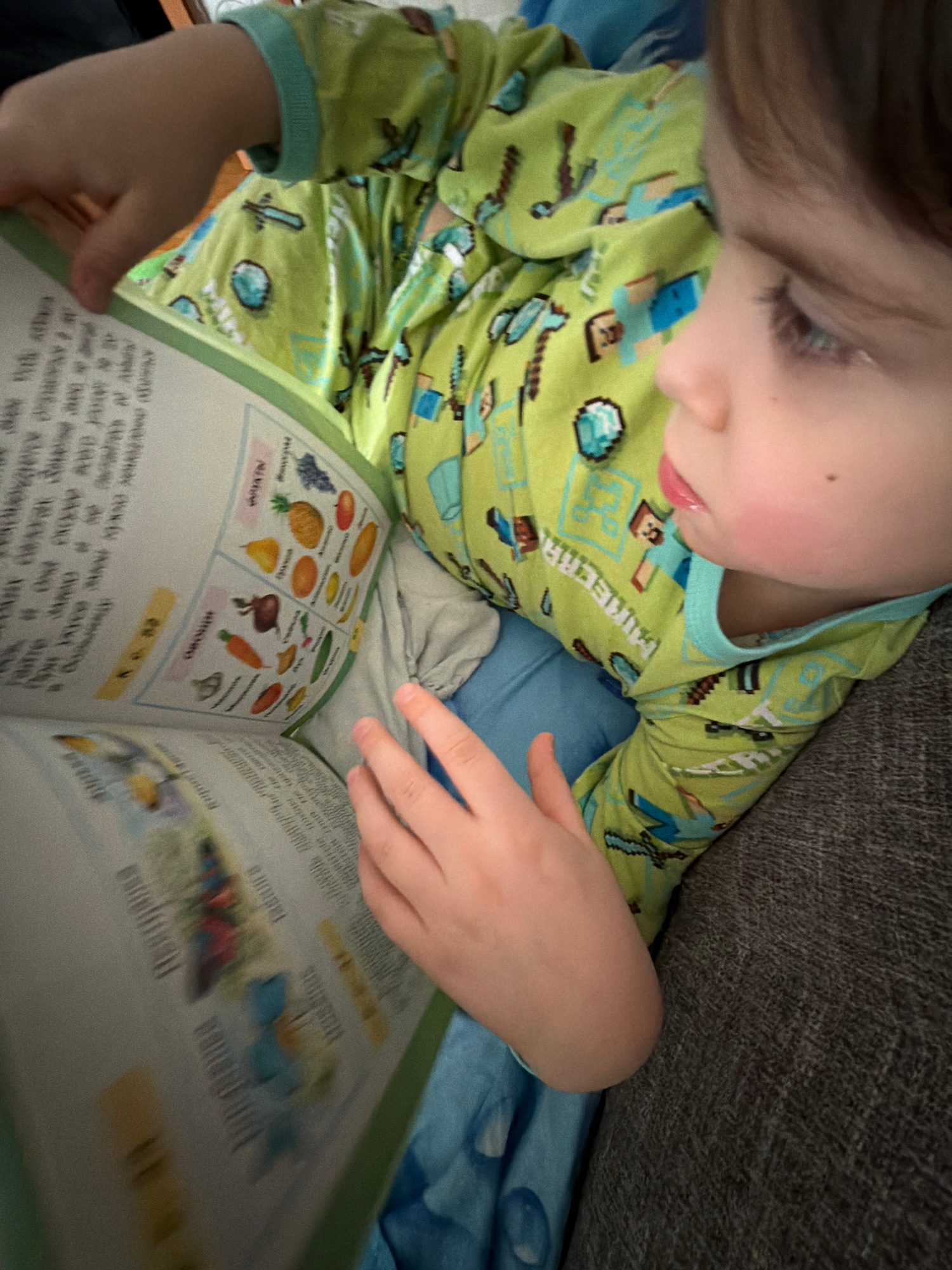 A young child wearing green Minecraft-themed pajamas is looking at an open book. The book appears to have a section on fruits and vegetables with labeled images. The child is positioned near a grey co…read more