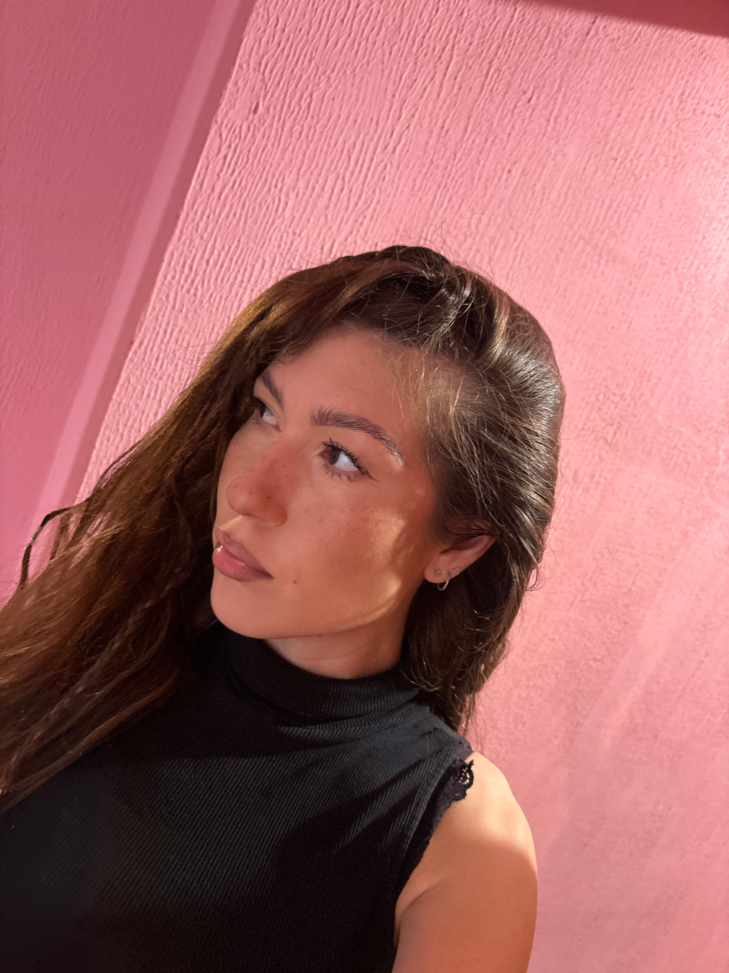 A photograph, taken from a low angle, features a young woman with long brown hair, fair skin, and freckles, positioned against a pink wall. She is wearing a black top, and her gaze is directed downwar…read more