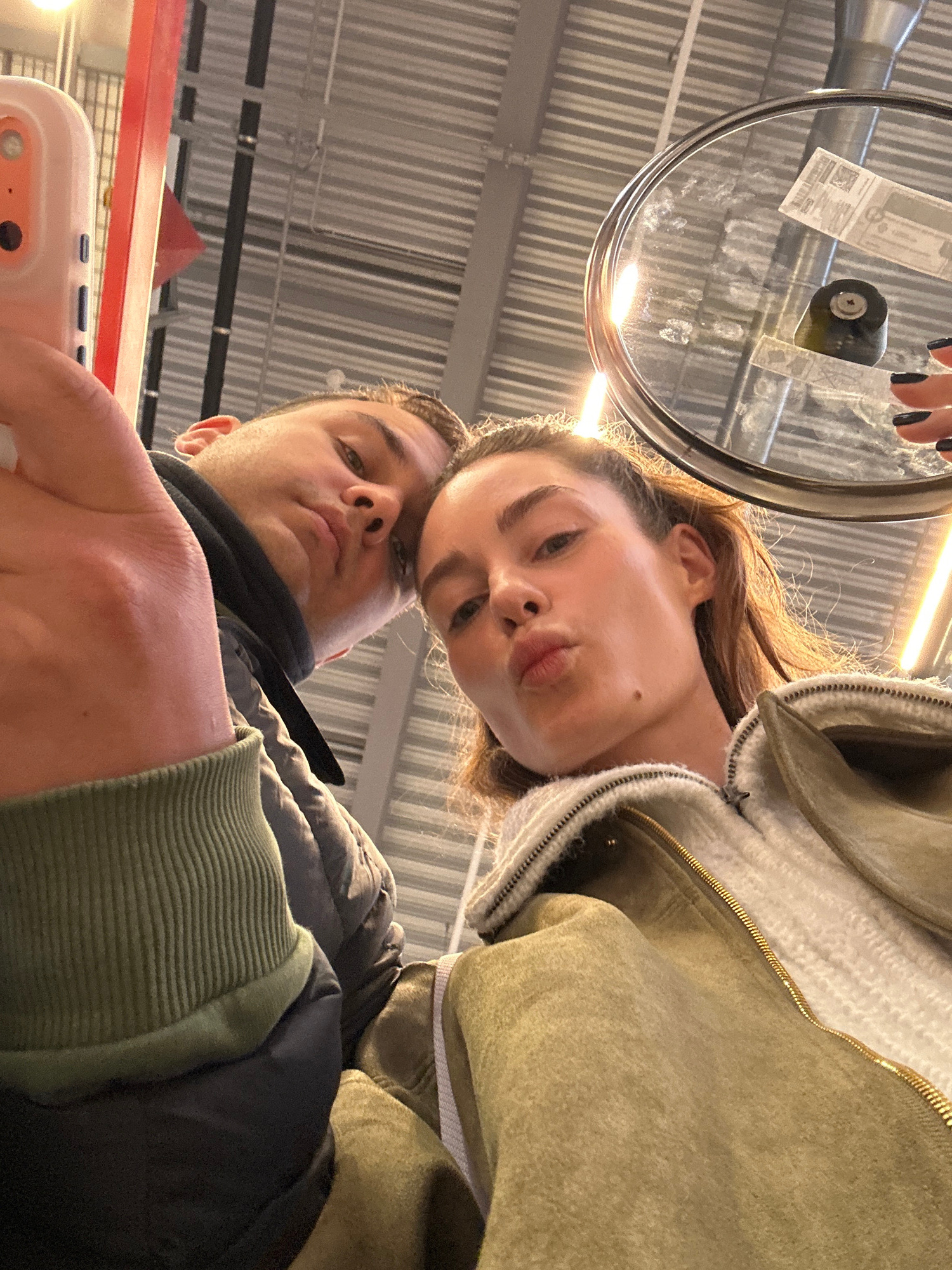 The image shows two individuals taking a selfie in what appears to be a commercial building with an industrial-style ceiling with linear fluorescent lighting. The woman is positioned at the top of the…read more