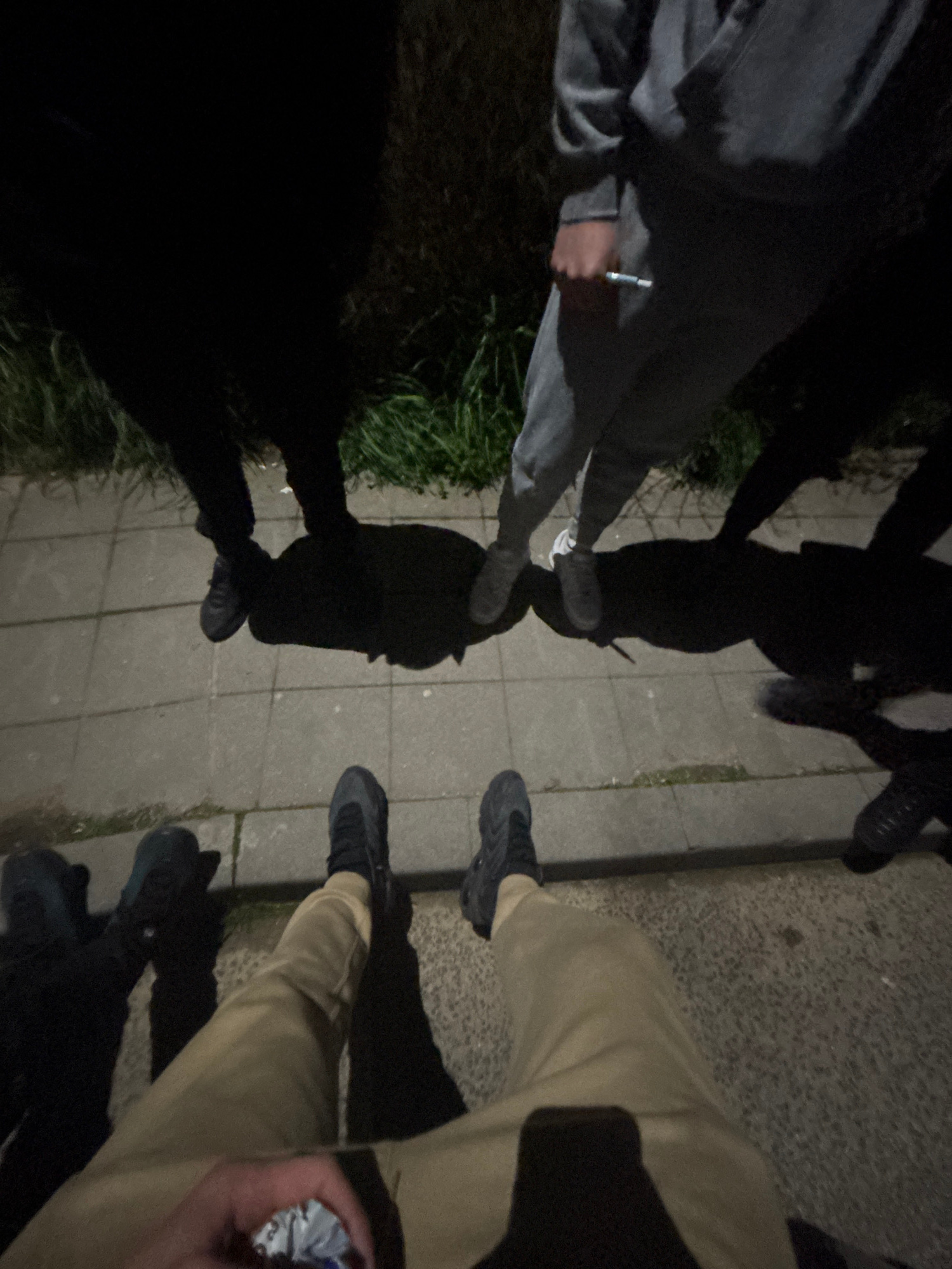 A group of people are standing together on a paved surface, likely a sidewalk, in what appears to be an urban environment. The photograph is taken from a high angle, looking down at the group. There a…read more