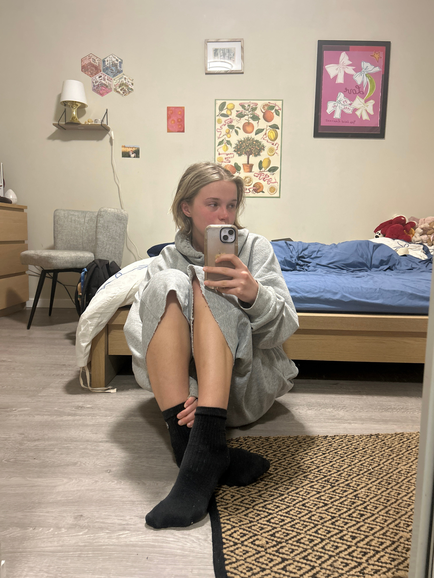 A young Caucasian female is seated on the floor in an indoor setting, seemingly a bedroom. She is wearing a gray hoodie and black socks, holding a smartphone in her right hand, presumably taking a sel…read more