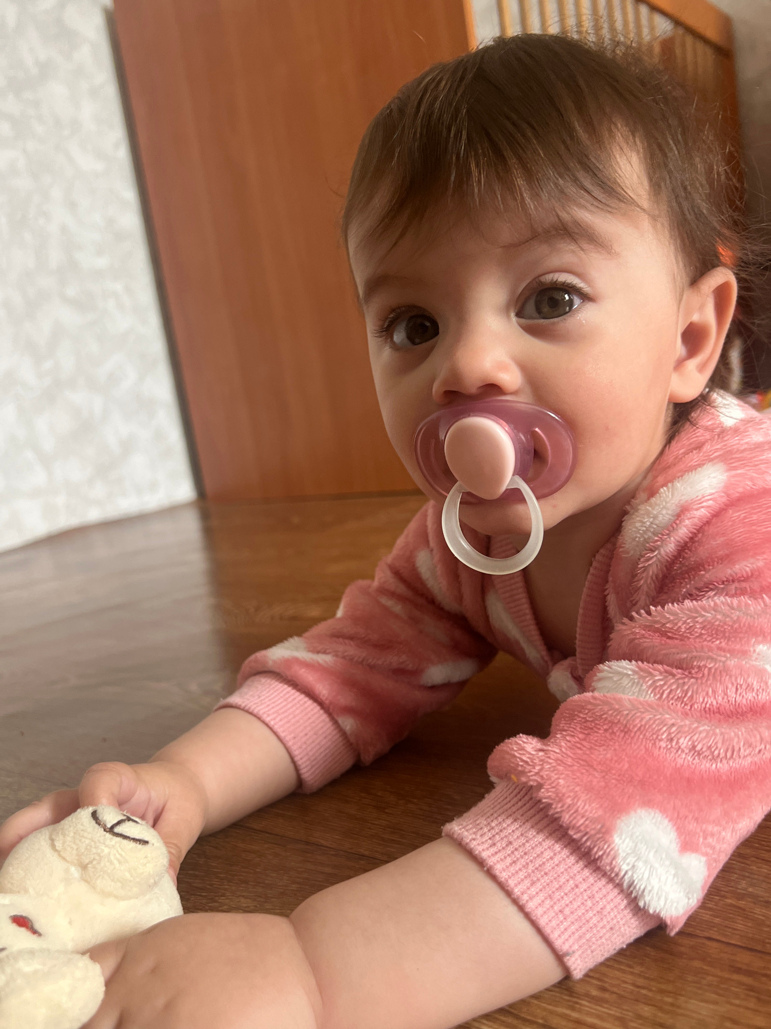 A baby with brown hair and eyes lies on a wooden floor. She is wearing a pink and white polka-dotted onesie and has a pink pacifier in her mouth. She holds a small, white stuffed animal in her right h…read more