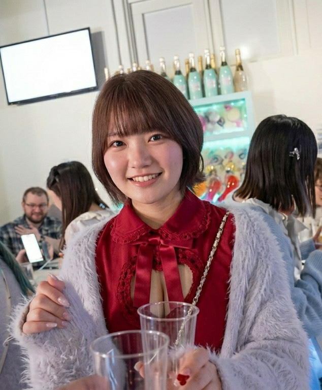 The image portrays an indoor gathering in Shinjuku, Japan. A young East Asian female, with short brown hair and bangs, occupies the foreground, smiling directly at the viewer. She is dressed in a dark…read more
