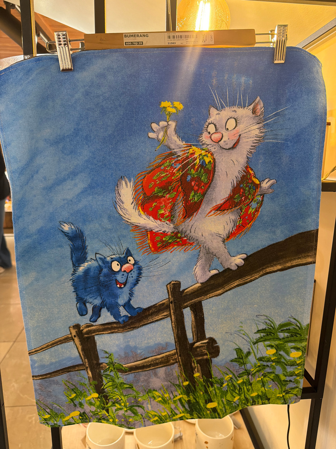 An image displays a fabric item, possibly a tea towel or small tapestry, featuring a whimsical cartoon illustration, held vertically by a wooden clothes hanger with metal clips. The photograph was tak…read more