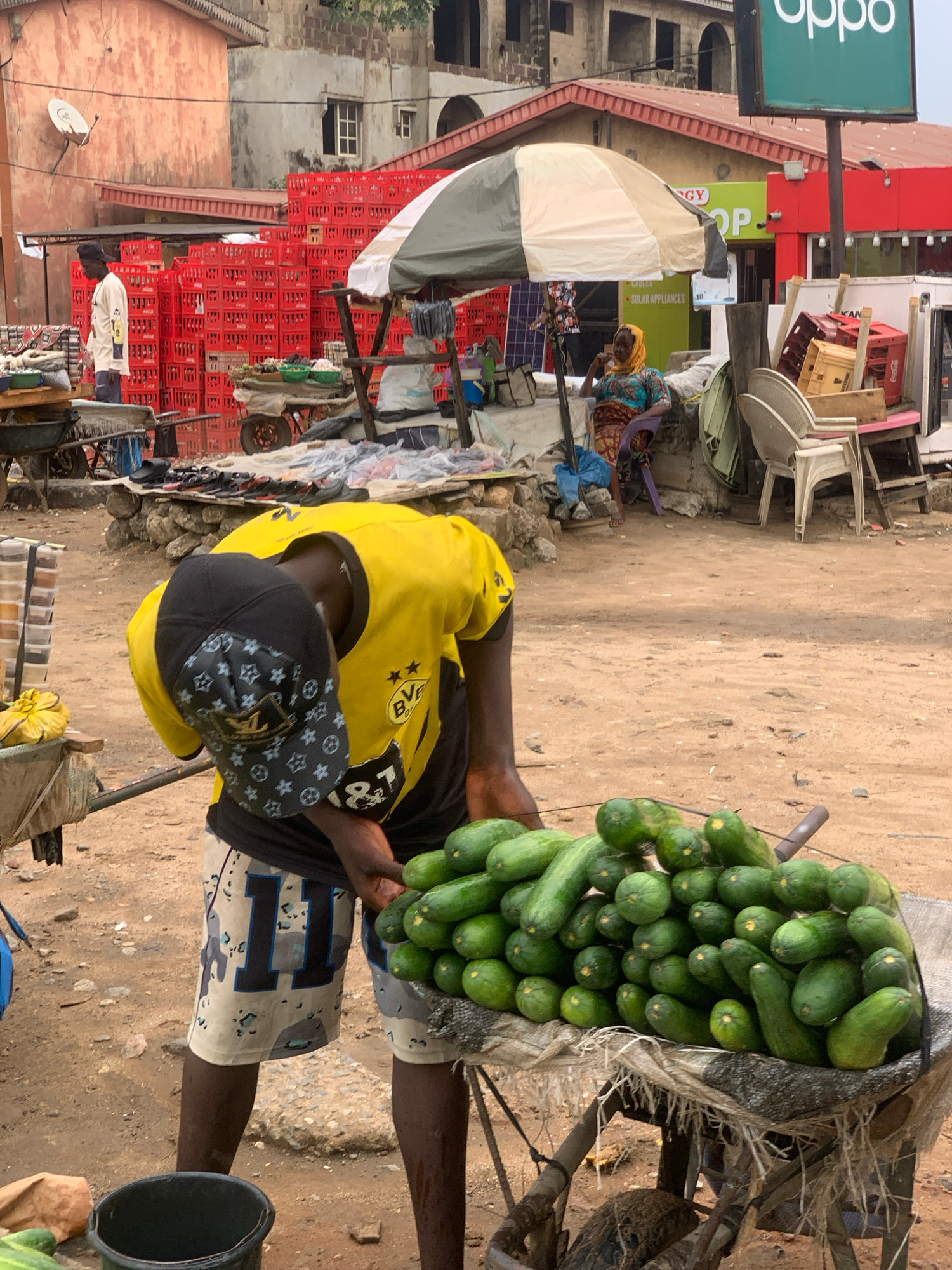 In a marketplace setting in Ikorodu, Nigeria, a vendor wearing a yellow and black shirt and patterned shorts stands beside a cart laden with cucumbers. The cucumbers are densely packed in a woven cont…read more