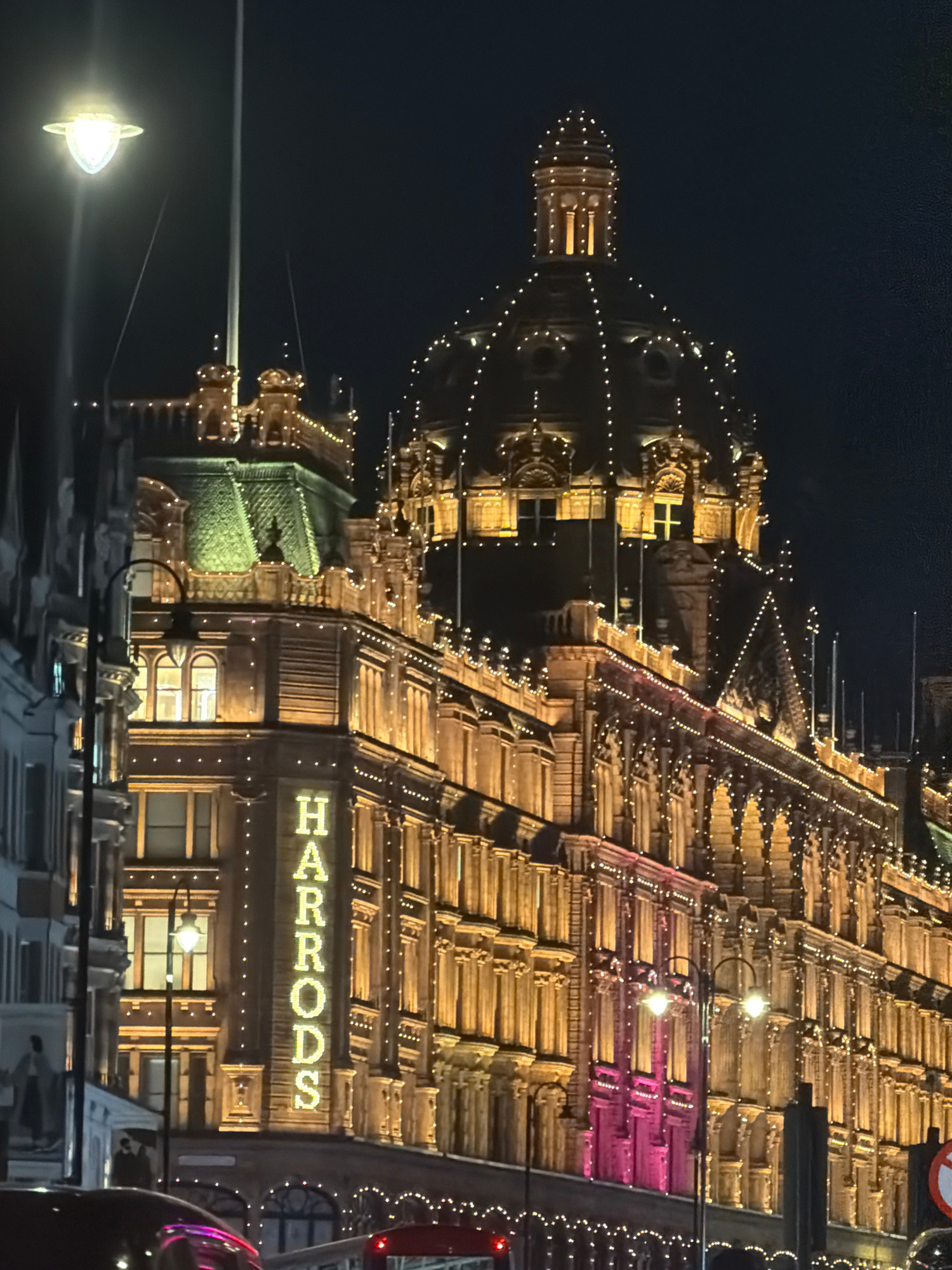 The image depicts the Harrods department store in London, United Kingdom, at night. The building is illuminated with numerous strings of lights, highlighting its architectural details and domes. The s…read more