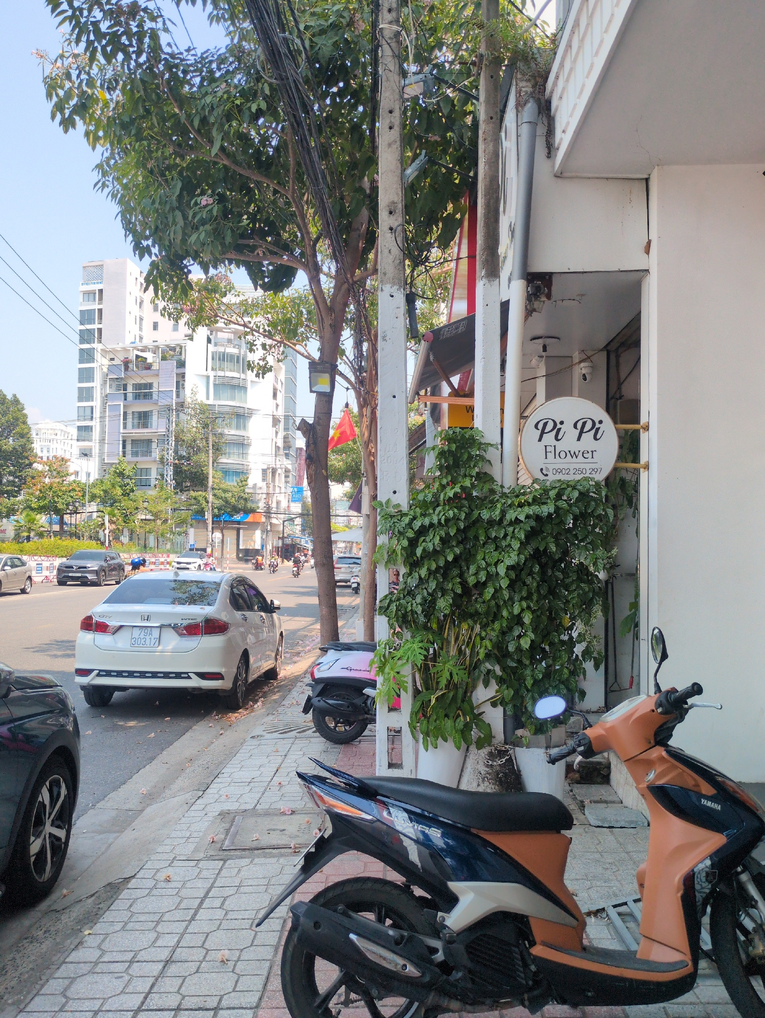 The image shows a street in Tây Nha Trang, Vietnam. A motorcycle is parked on the sidewalk next to a flower shop named "Pi Pi Flower" with the phone number 0902 250 297. A white Honda car, license pla…read more