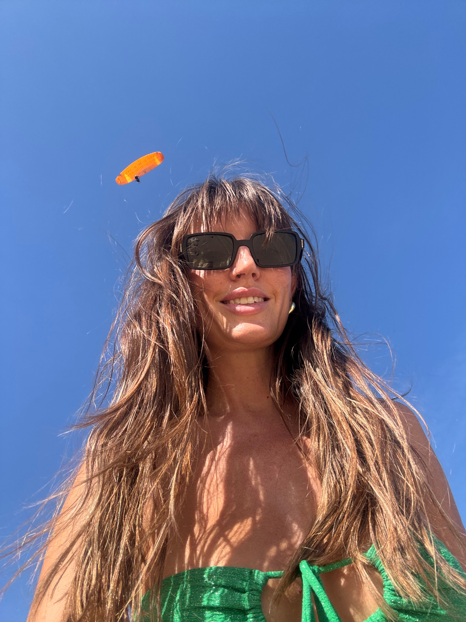 A woman wearing sunglasses and a green top looks up at a clear blue sky where a paraglider is visible. The location is likely the city of Kuta Selatan, Indonesia.