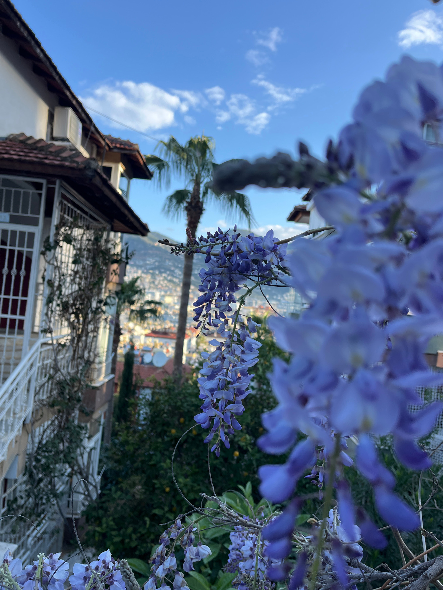 The image depicts a residential outdoor scene in Alanya, Turkey, under bright daylight. The immediate foreground is dominated by clusters of vibrant purple wisteria flowers, some in sharp focus and ot…read more
